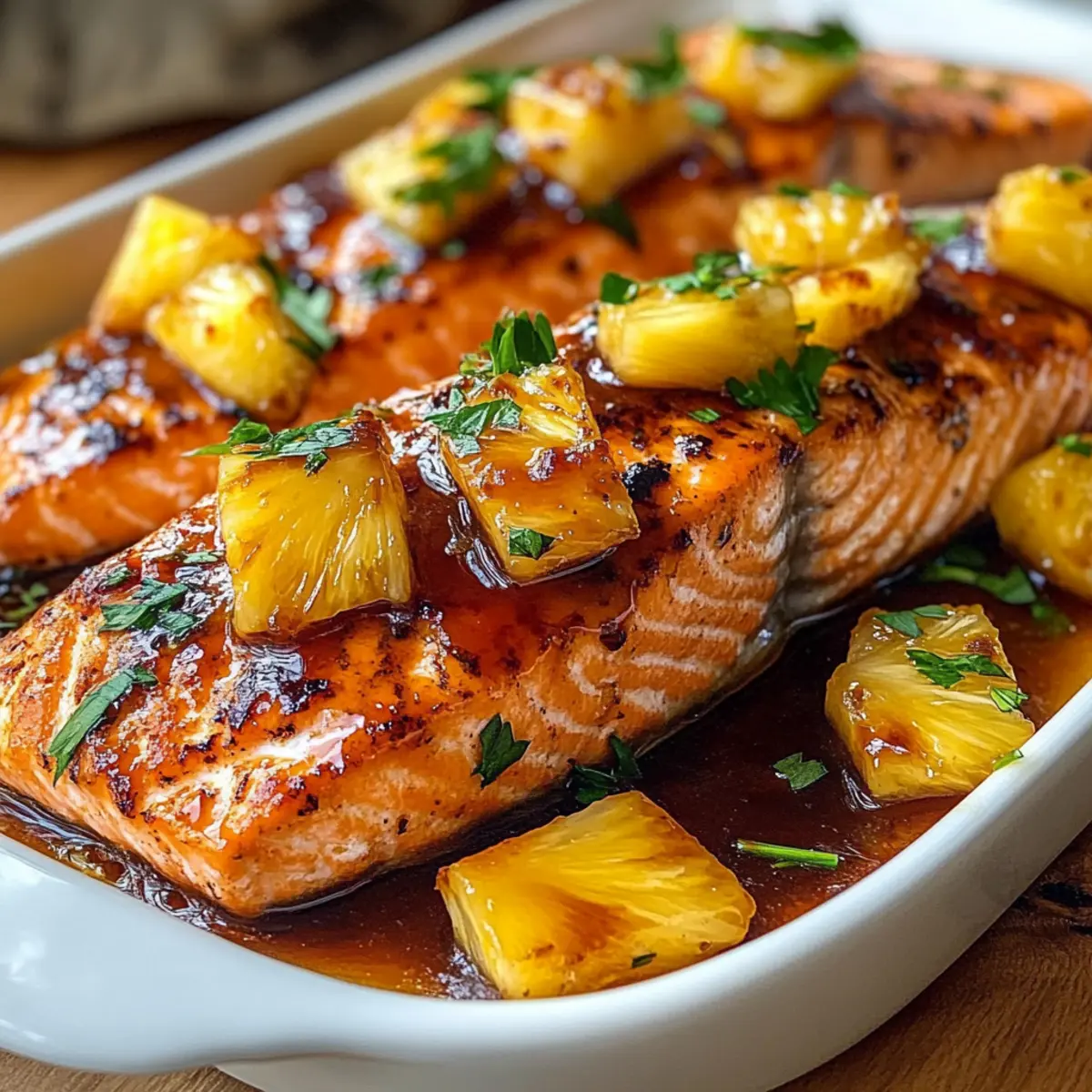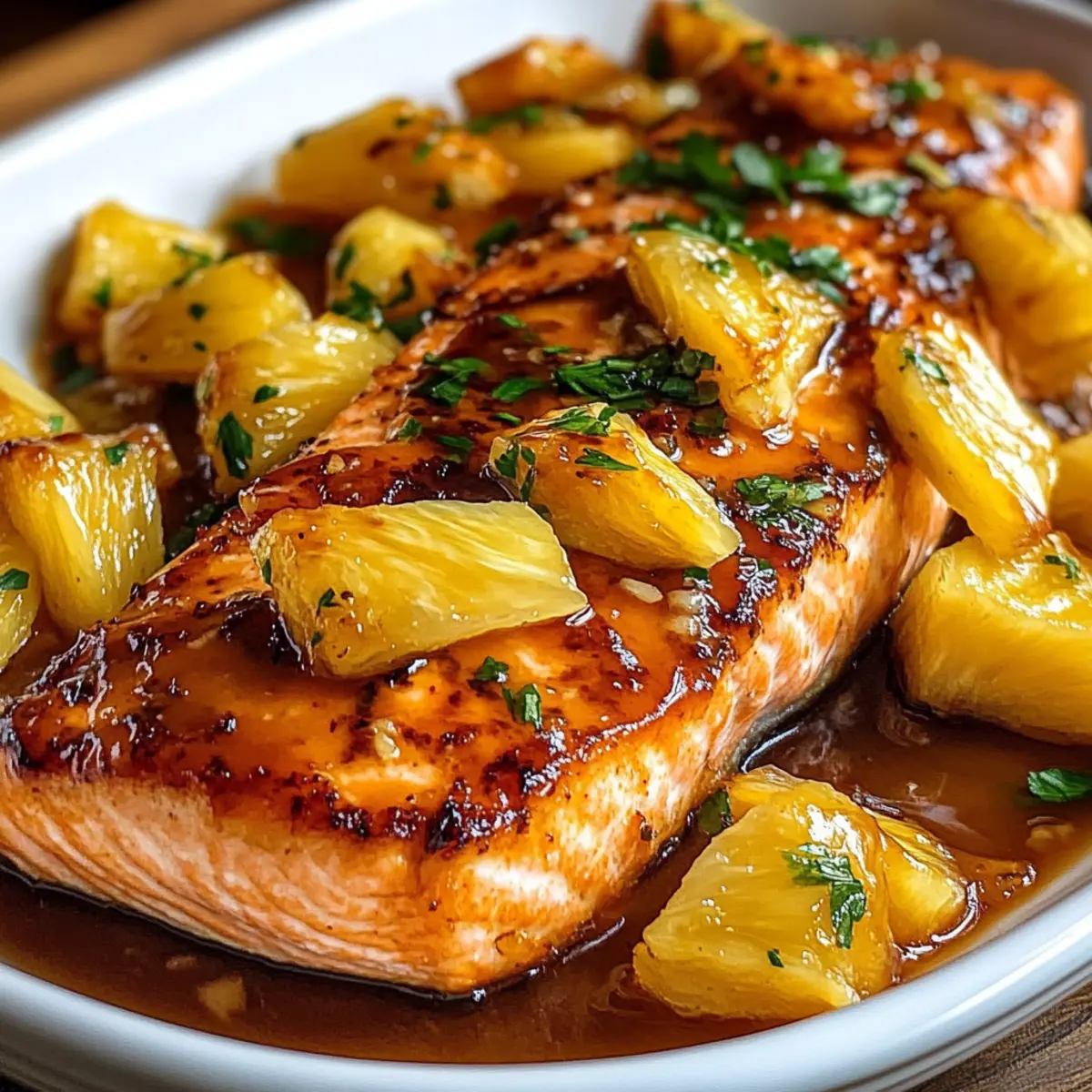 Die Ananas-Glasierte Lachs ist perfekt für vielbeschäftigte Köche, die Zeit sparen möchten! Du kannst die Glasur bis zu 3 Tage im Voraus zubereiten und im Kühlschrank aufbewahren, um die Aromen zu intensivieren. Das Lachsfilet kann ebenfalls bis zu 24 Stunden im Voraus mit Salz, Pfeffer und Olivenöl mariniert werden – dies hilft dabei, die Textur zart und saftig zu halten. Wenn du bereit bist zu servieren, heize einfach den Ofen vor, lege die marinierten Filets in die gefettete Auflaufform, gieße die Glasur darüber und backe sie für 12-15 Minuten. Der Lachs bleibt auch nach dem Vorbereiten genauso köstlich, sodass du dir Zeit für andere Aufgaben nehmen kannst!