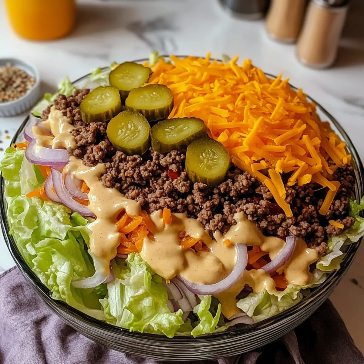 Egal, ob du einen hektischen Tag hast oder einfach nur Lust auf eine köstliche Mahlzeit, mein Big Mac Salat Rezept bringt die beliebten Aromen deines Lieblingsburgers direkt in eine frische Schüssel. Diese gesunde Version des Fast-Food-Klassikers ist nicht nur schnell zuzubereiten – du brauchst weniger als 20 Minuten – sondern auch perfekt für eine kohlenhydratarme Ernährung. Jedes Bisschen ist voller knackiger Gemüse und saftigem Rinderhack, das zusammen mit einer cremigen Soße ein wahres Geschmackserlebnis bietet. Und das Beste daran? Du kannst das Rezept ganz nach deinen Wünschen anpassen! Was hältst du davon, deine eigene Variante zu kreieren?