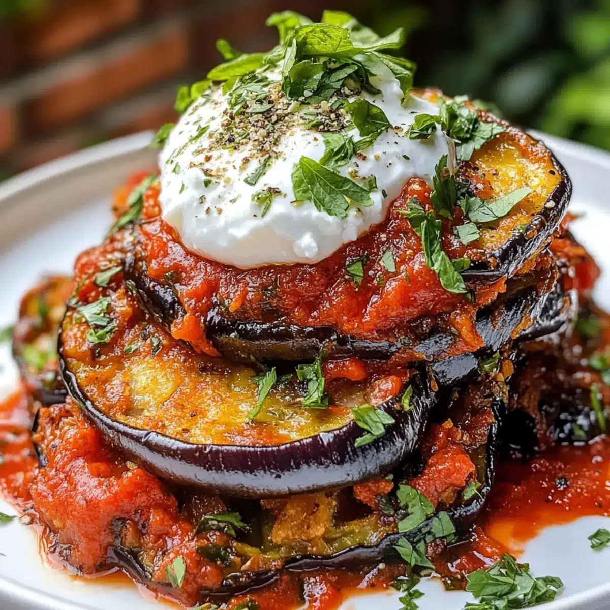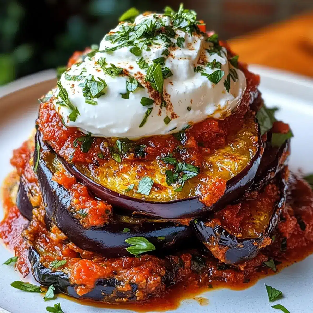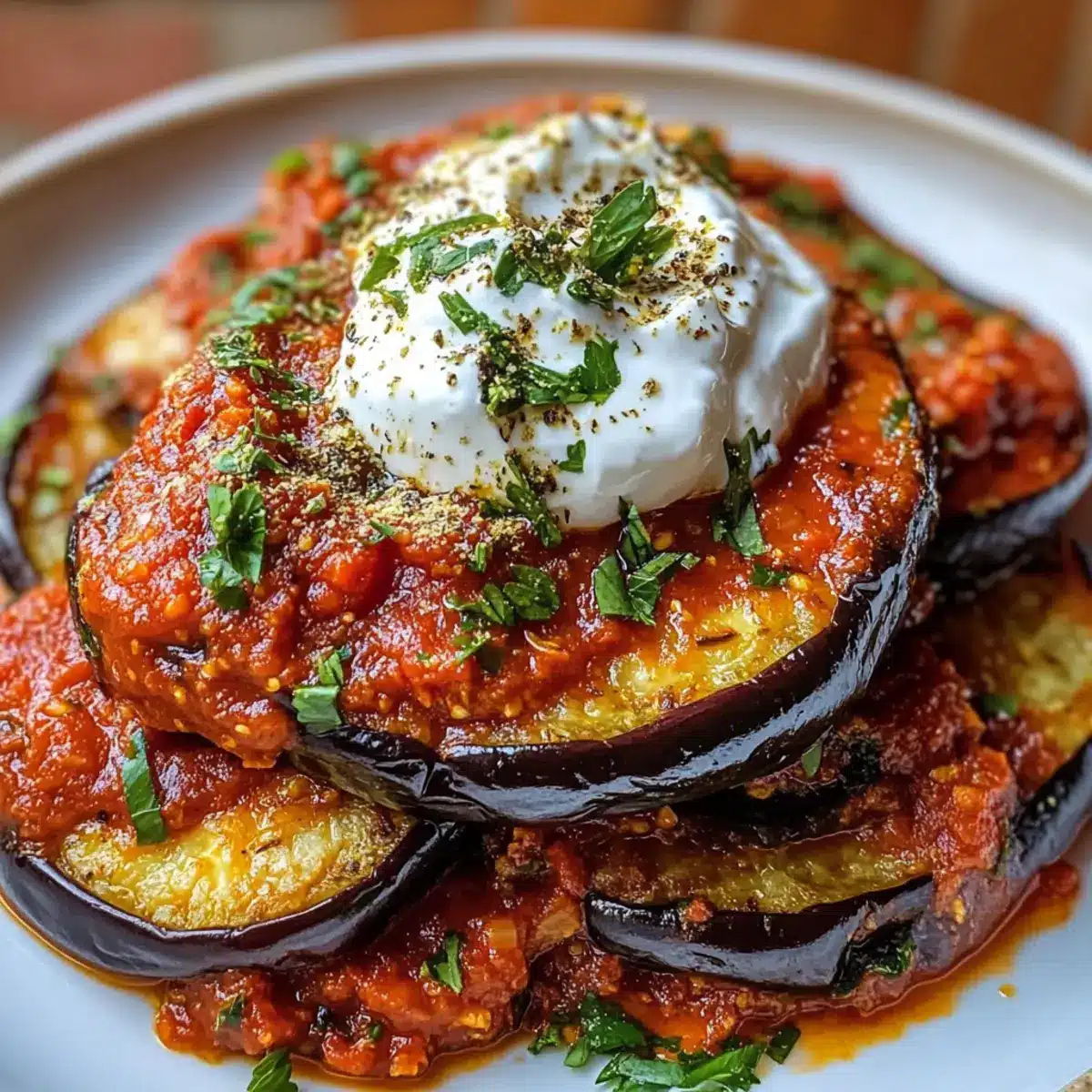 - Lege die frittierten Auberginen auf einem großen Teller oder einer Servierplatte übereinander. Gieße großzügig die gewürzte Tomatensauce über die Auberginen und toppe sie mit einer Löffel der herben Joghurtsoße. Garniere mit zusätzlicher frischer Petersilie und Minze für einen frischen Farbkontrast.