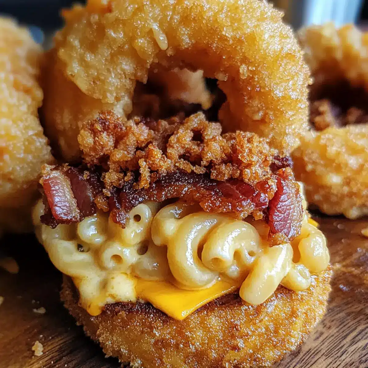 Käse Bacon Mac Burger gefüllte Zwiebelringe genießen