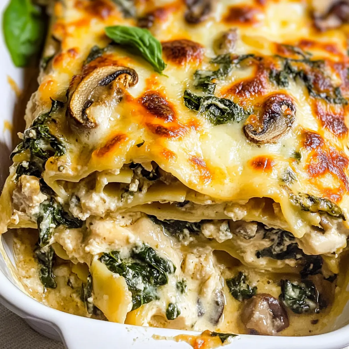 Weiße Hühnerlasagne mit Spinat und Pilzen
