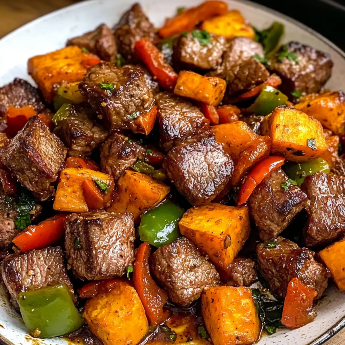 Protein Steak Bites mit Süßkartoffeln und Paprika lecker zubereiten