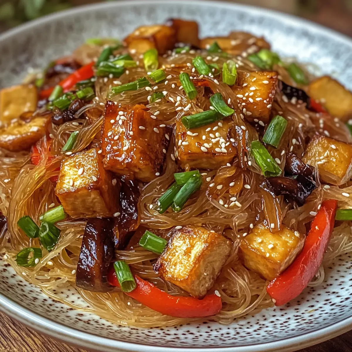 Gebratene Vermicelli mit geräuchertem Tofu und Shiitake
