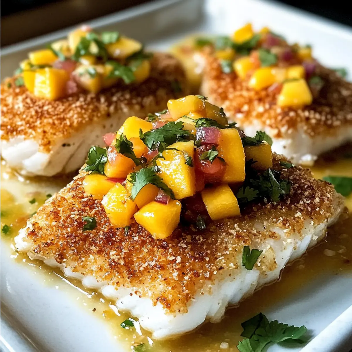 Tropischer Kokosnusskruste Fisch mit Mangosalsa genießen