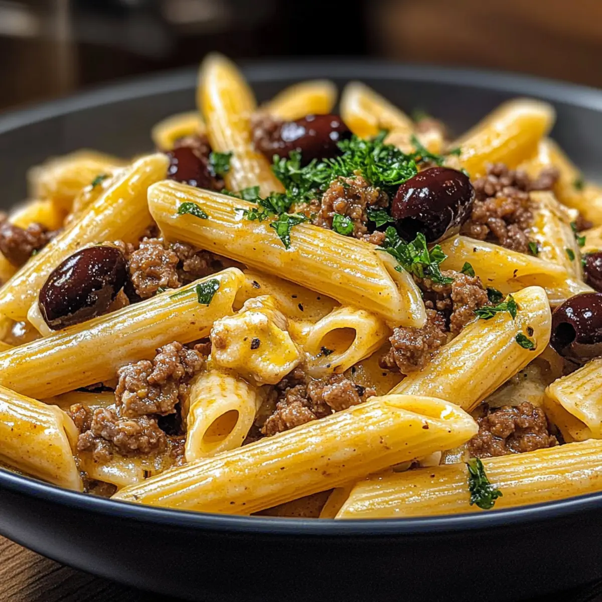 Cremige Kalamata-Rindfleisch-Pasta für die Seele