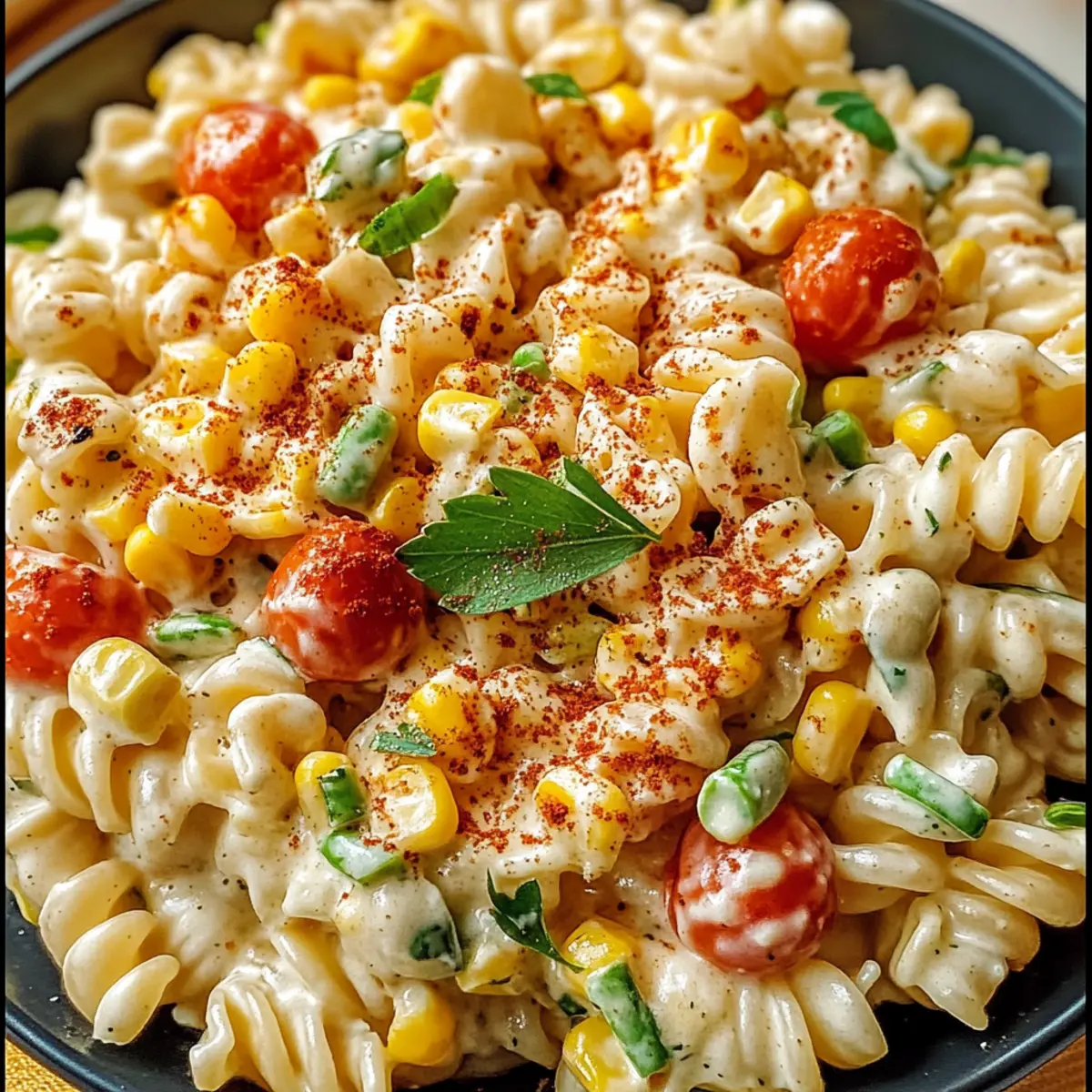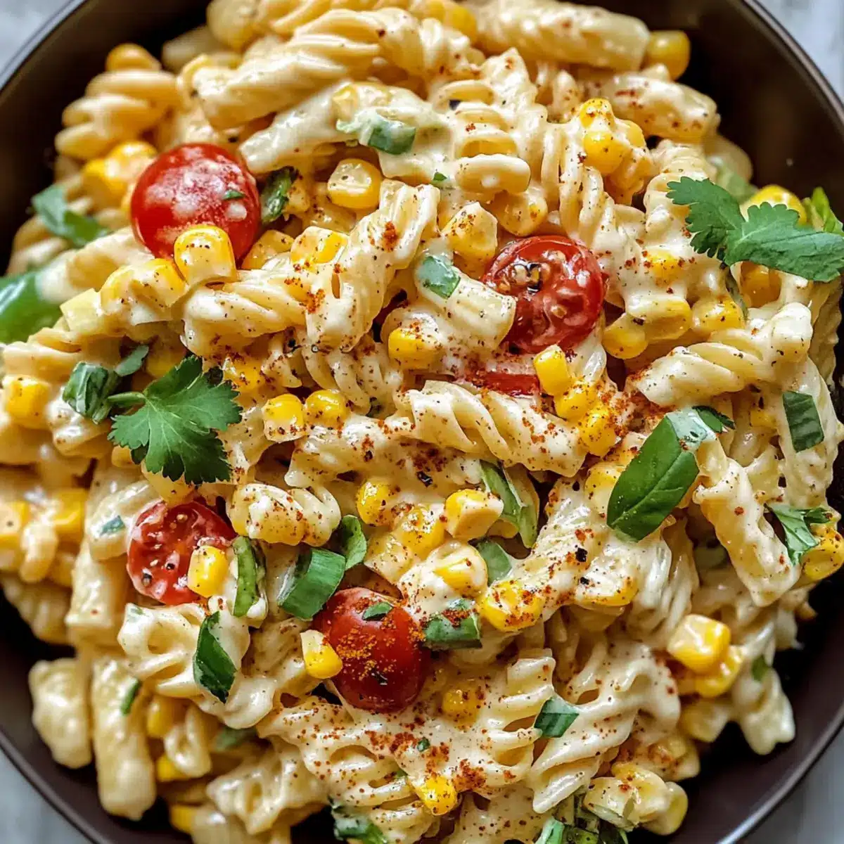 Gesunde Wahl: Dieser cremige Straßenmais-Pasta-Salat ist eine nahrhafte, vegetarische Option, die selbst Kinder begeistert. Deine Gäste werden ihn lieben!