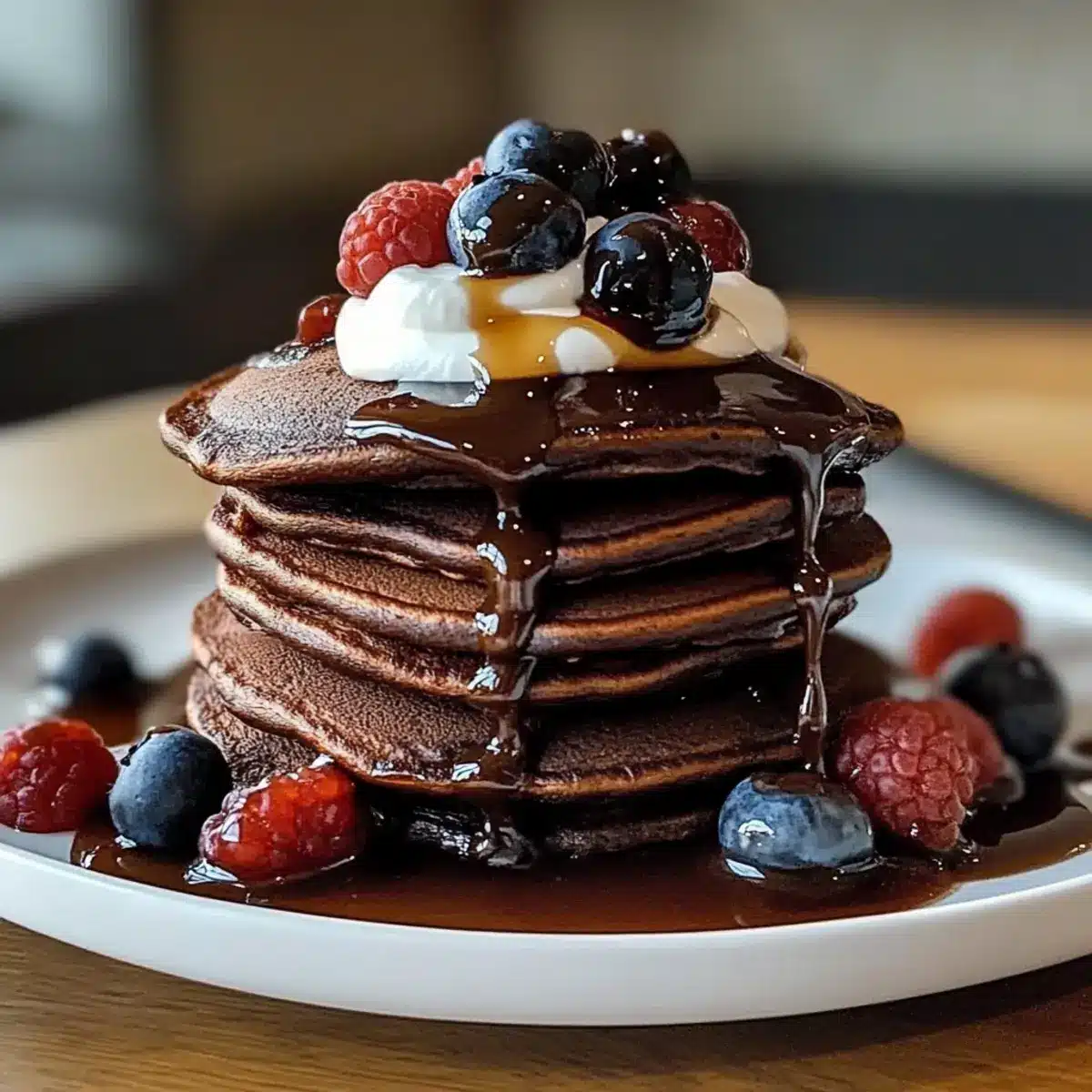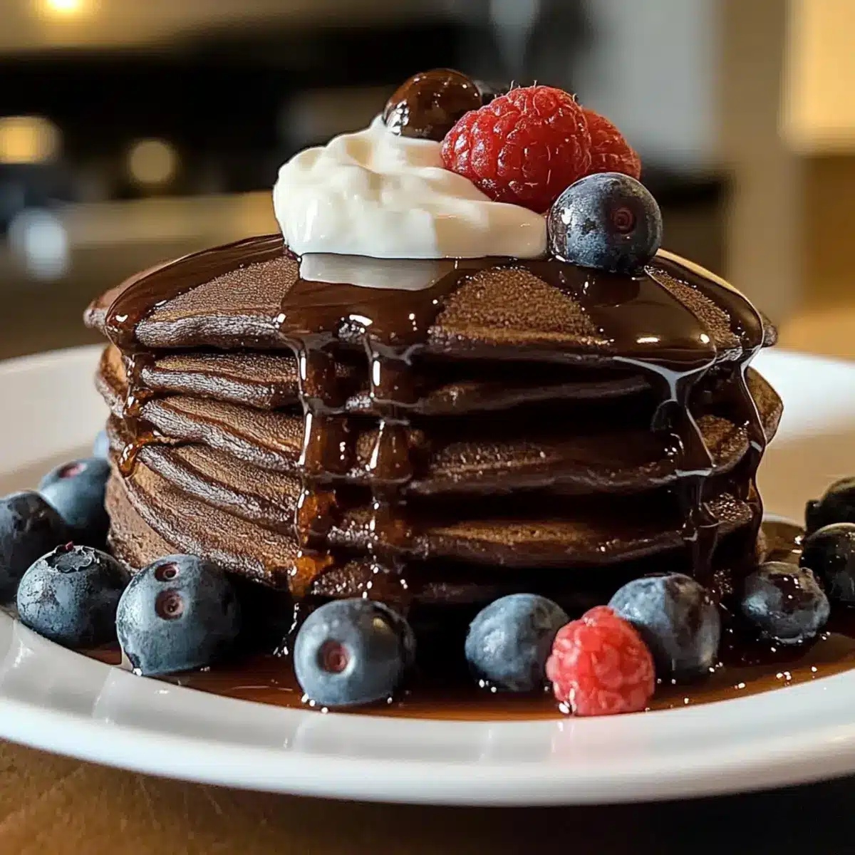 Serviere die frisch gebackenen dekadenten Schokoladen-Protein-Pfannkuchen warm mit deinen Lieblingsbelägen wie frischen Beeren, einem Hauch von Kakaopulver oder einem Klecks griechischem Joghurt. Genieße dein köstliches und gesundes Frühstück!