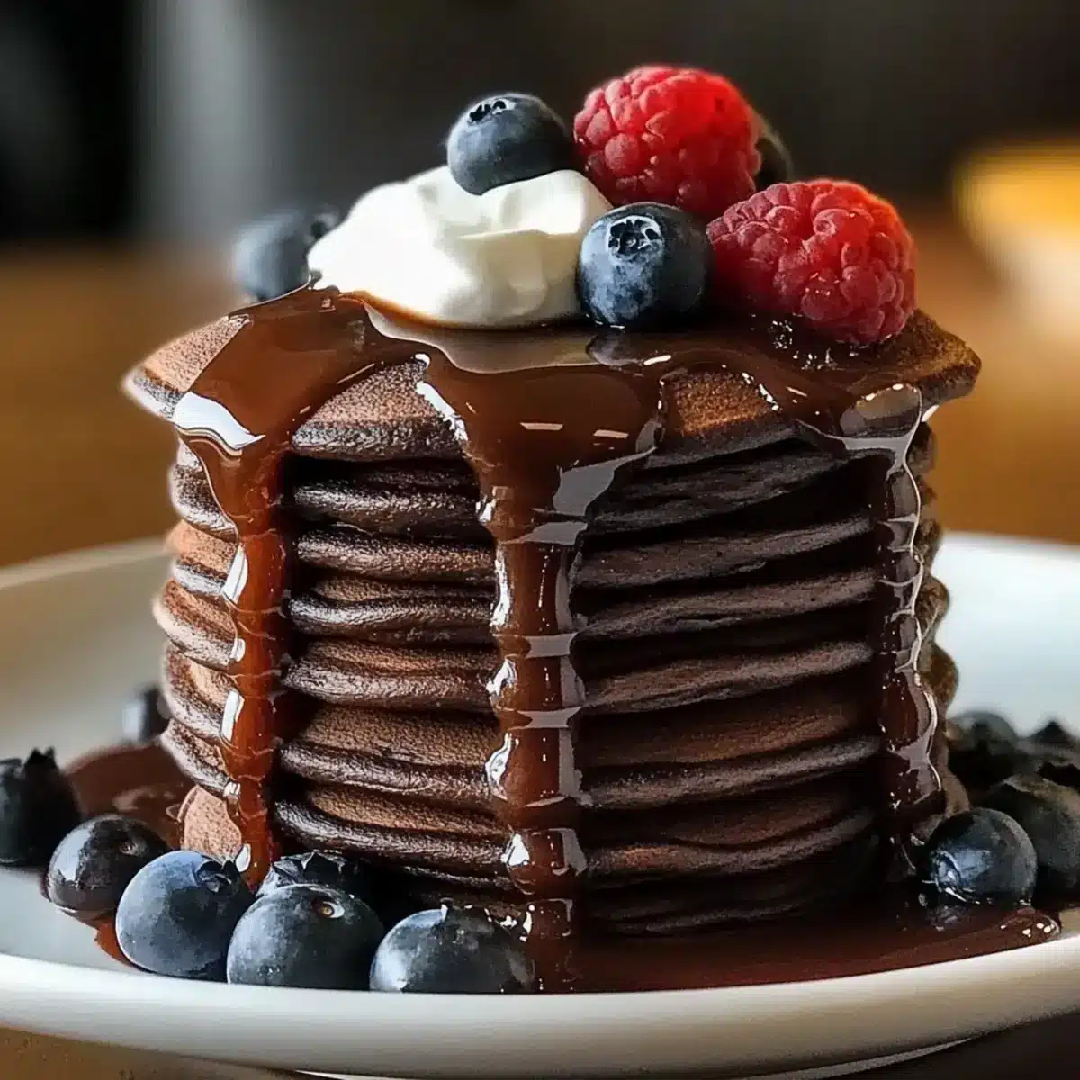 Himbeeren, Heidelbeeren oder Erdbeeren bringen einen frischen, fruchtigen Kontrast zu den schokoladigen Pfannkuchen. Ihre natürliche Süße ergänzt den herzhaften Geschmack perfekt. -