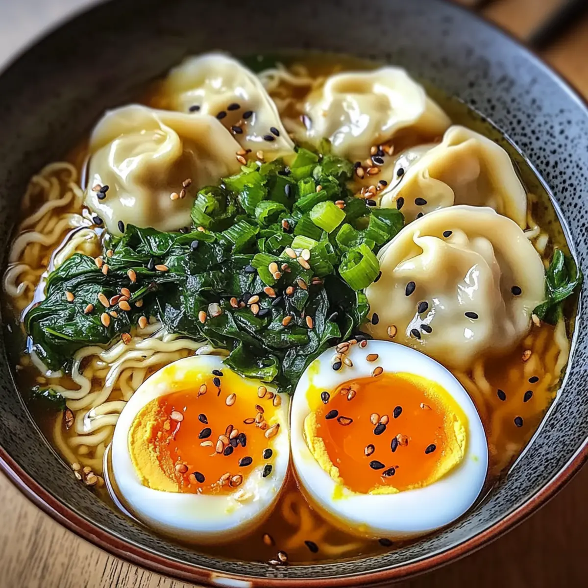 „Hast du schon einmal von einem Gericht geträumt, das dich sofort nach Asien versetzt? Der Dumpling Ramen Schüssel bringt diese kulinarische Reise direkt in deine Küche! Mit zarten gefrorenen Dumplings, goldgelben, weichgekochten Eiern und frischem Spinat in einer aromatischen Brühe ist dieses Gericht nicht nur ein wahrer Genuss, sondern auch in nur 25 Minuten zubereitet. Perfekt für einen entspannten Abend, bietet es dir die Möglichkeit, deine liebsten Kombinationsmöglichkeiten zu erkunden – sei es mit verschiedenen Gemüse oder Brühen. Ein unkompliziertes und anpassbares Komfortessen, das die ganze Familie glücklich macht. Bereit, dieses köstliche Erlebnis auszuprobieren? Lass uns loslegen und unsere Küche in ein kleines asiatisches Restaurant verwandeln!“