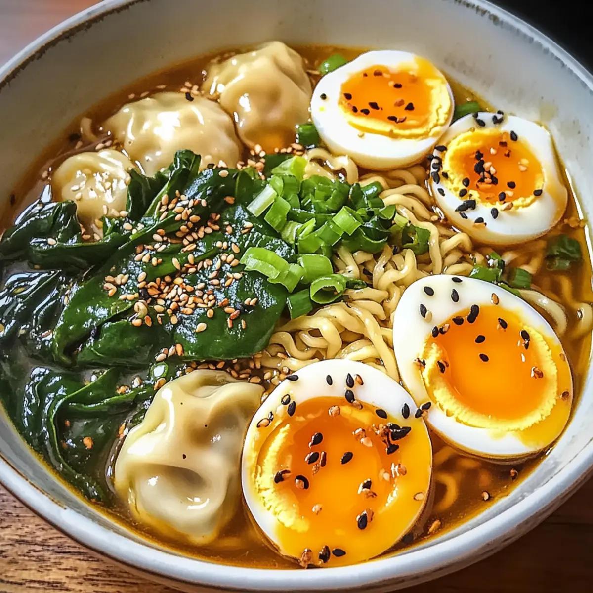 Verteile die Nudeln, Dumplings und Spinat gleichmäßig auf Schüsseln. Halbiere die weichgekochten Eier und lege sie elegant auf jede Portion. Garniere mit den geschnittenen Frühlingszwiebeln und einem Sprinkler schwarzer Sesamsamen für zusätzlichen Geschmack und eine schöne Präsentation.