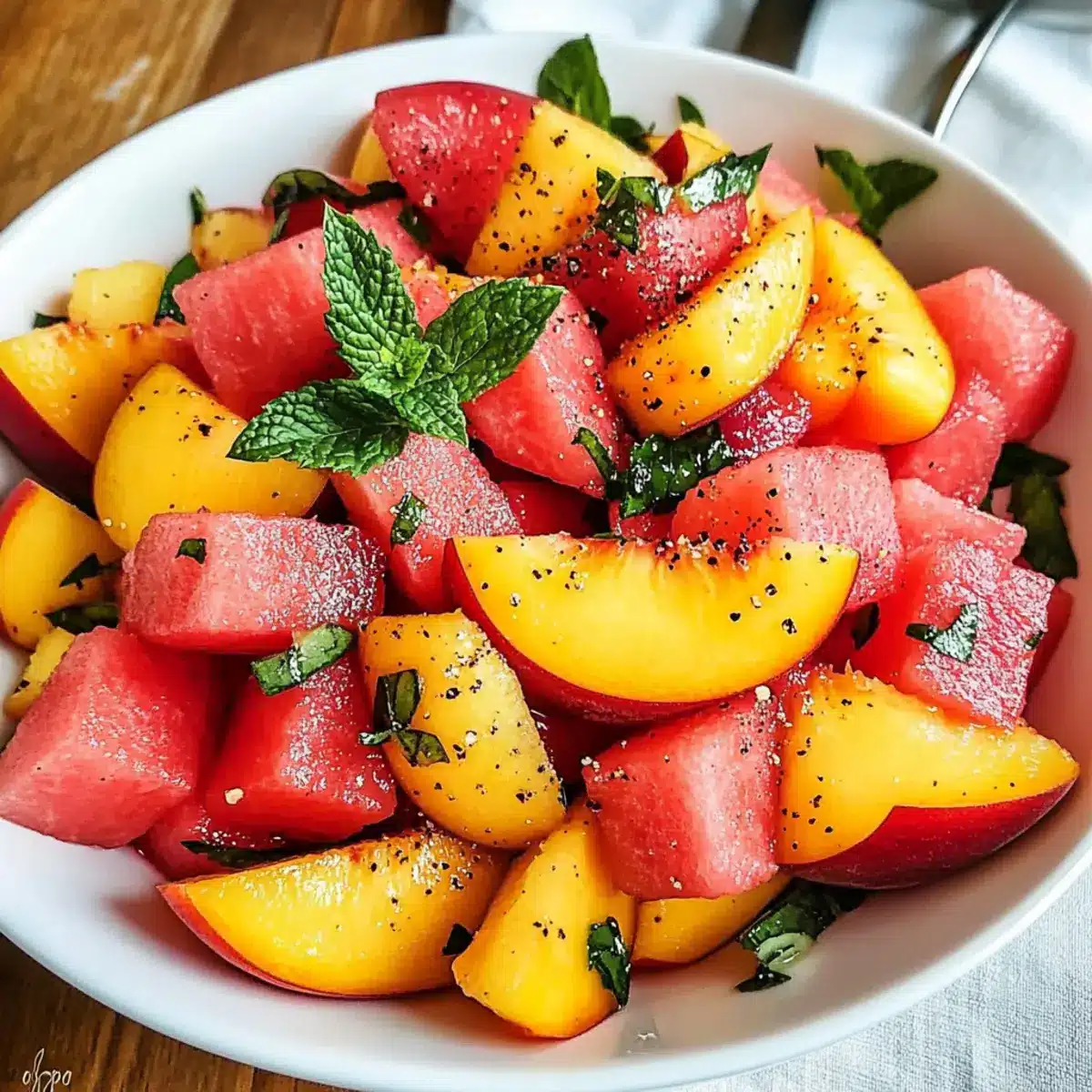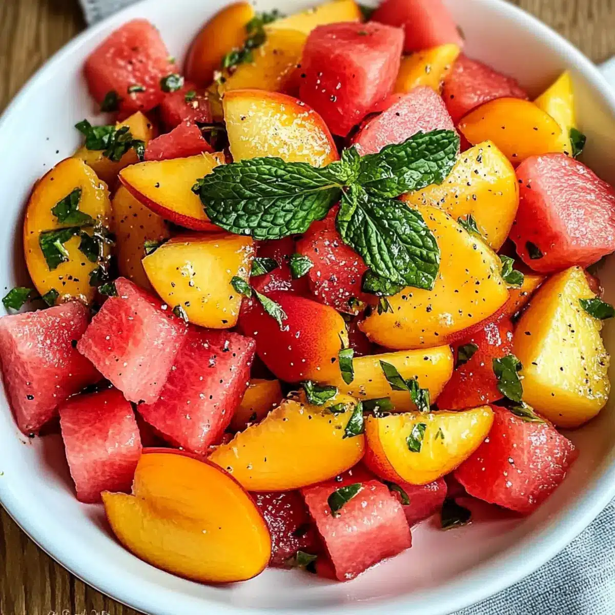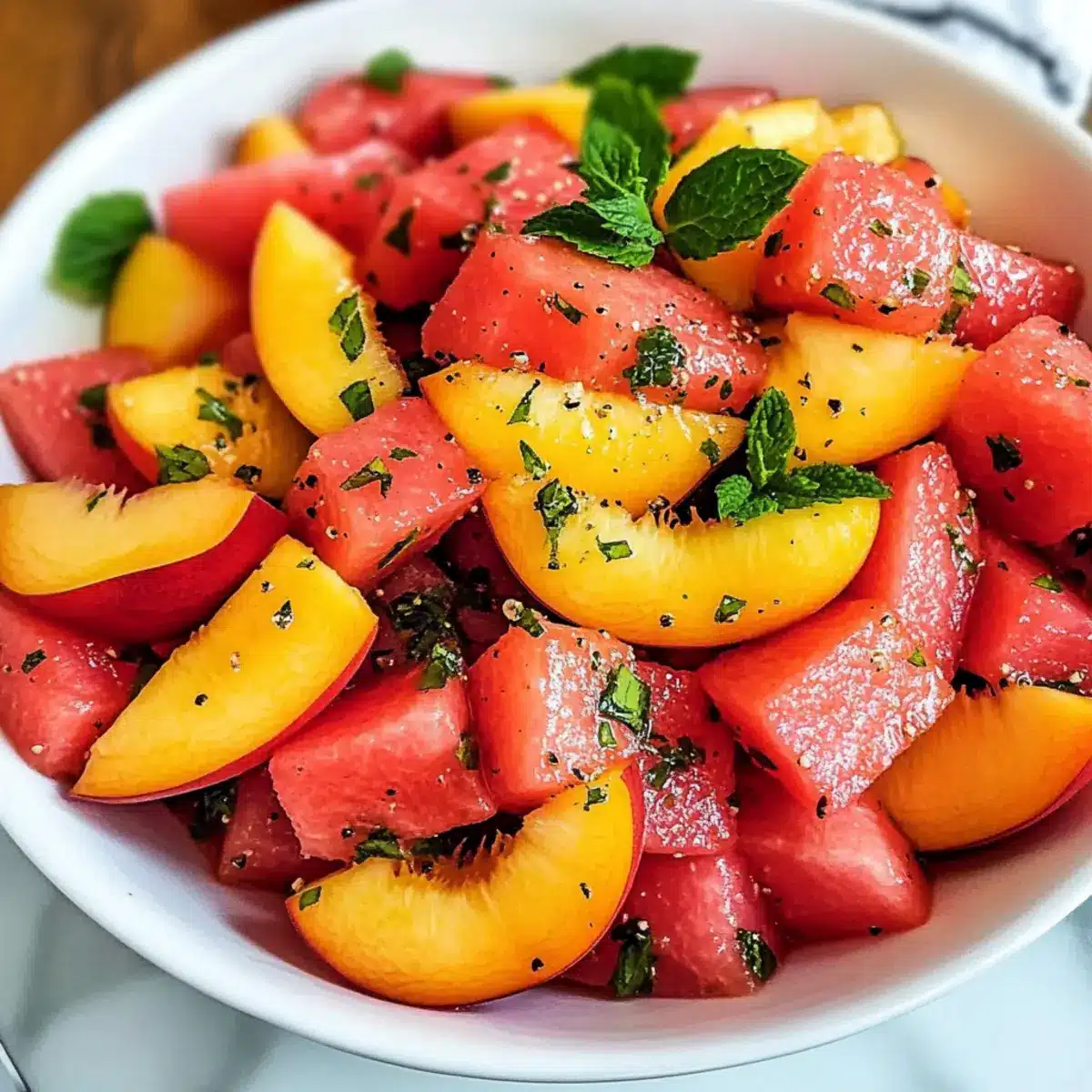 Frische und Leichtigkeit: Dieser Einfache Sommerpfirsich-Wassermelonen-Salat ist der perfekte Partner für heiße Sommertage. Er bringt mit jedem Bissen ein erfrischendes Gefühl, ideal für eine schnelle, gesunde Mahlzeit!