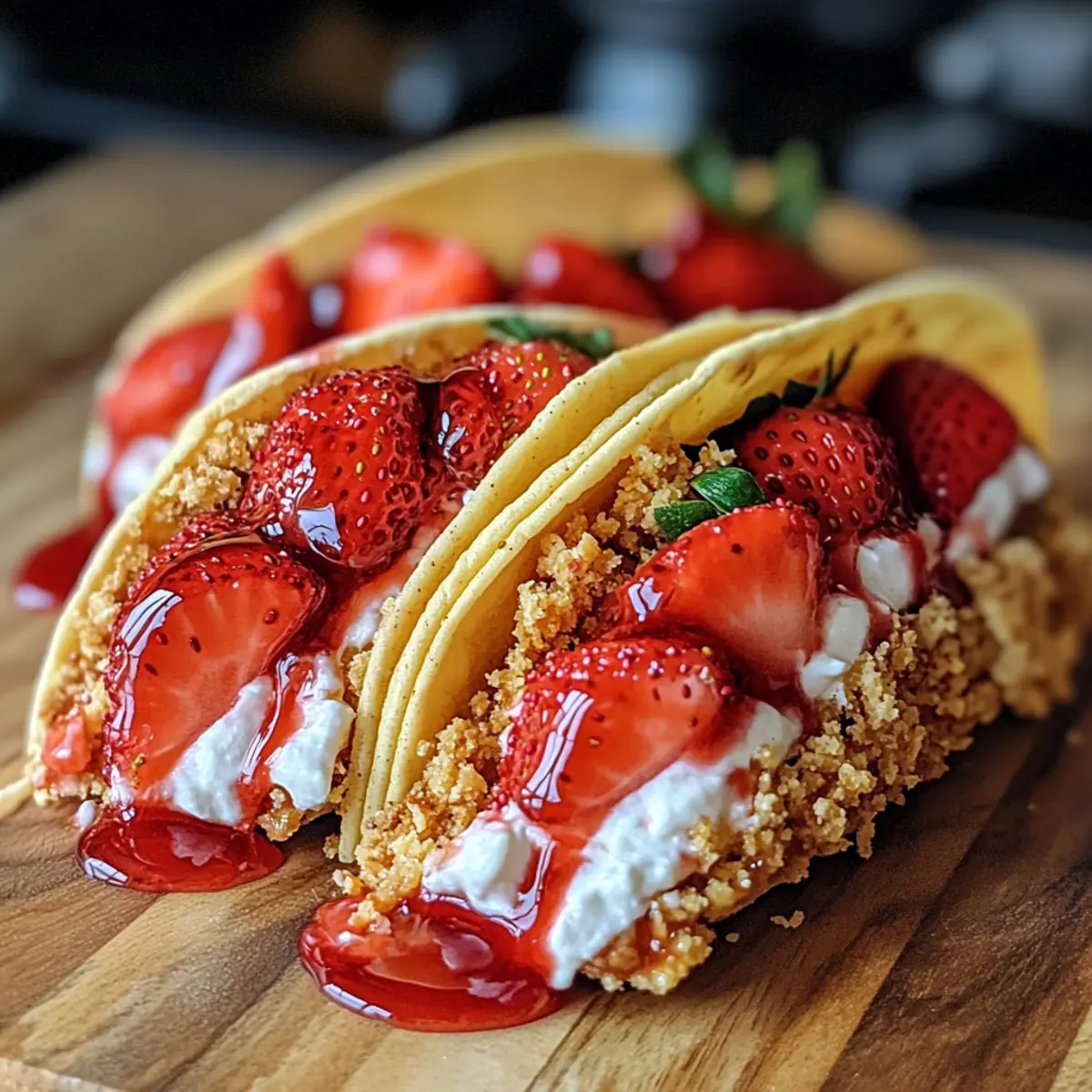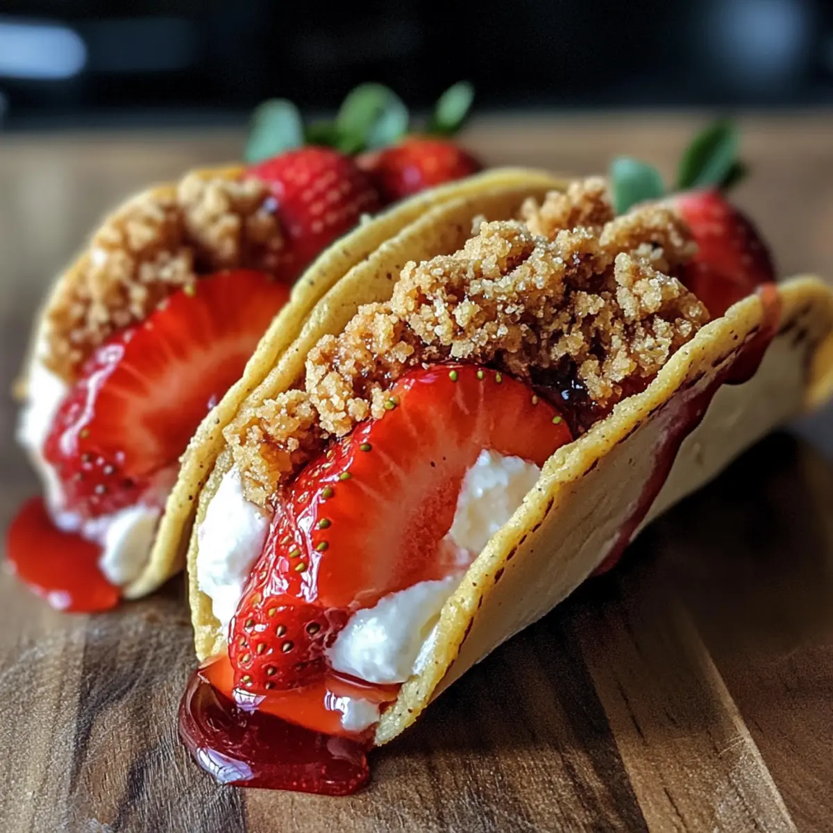 - Drizzle den Erdbeersirup über die gefüllten Taco-Schalen und serviere sie sofort, um die volle Frische und den Geschmack zu genießen.