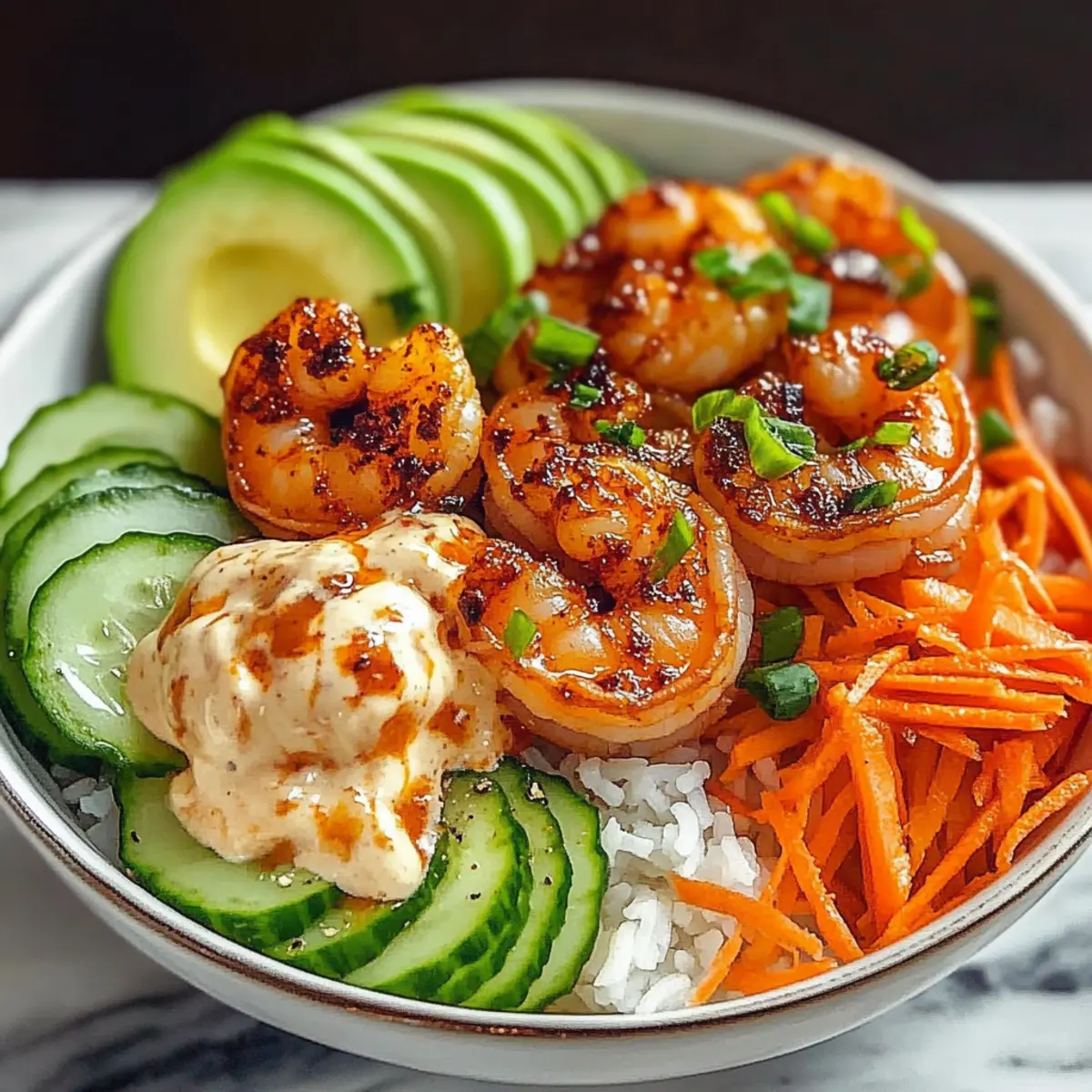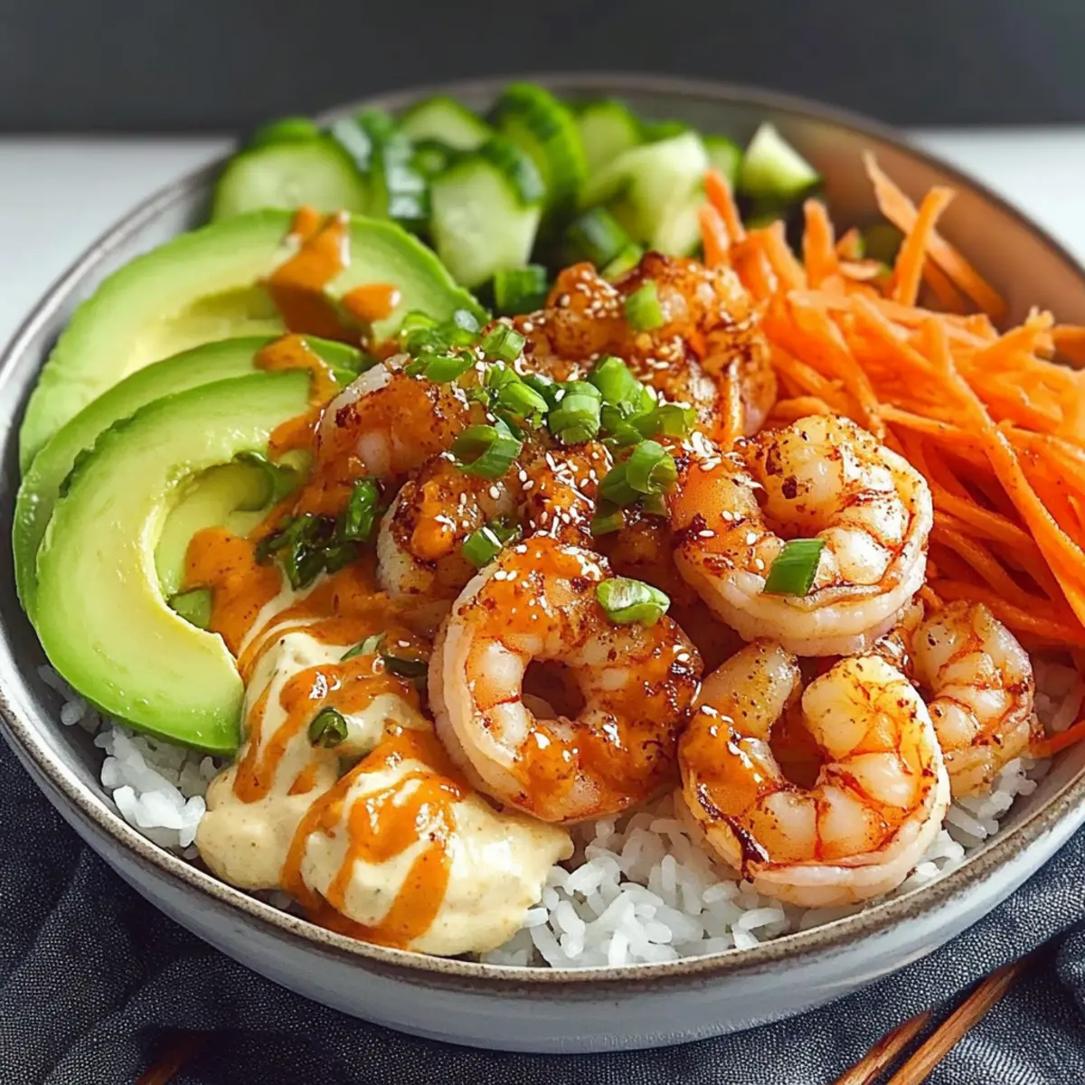 Frische Zutaten: Nutze frisches Gemüse für den besten Geschmack und die schönste Präsentation. Crunchy Gurken und süße Karotten bringen nicht nur Farbe, sondern auch Textur in die Garnelen-Reisbowl mit scharfer Mayo.