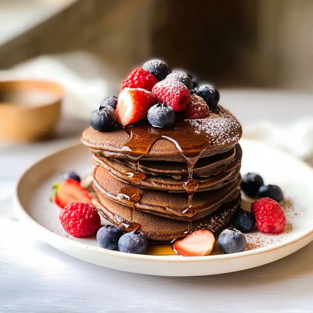 Ahornsirup: Ein klassischer Begleiter, der die Süße der Pfannkuchen hervorhebt. Der süße Nebengeschmack ergänzt die Schokolade wunderbar und ist ein absolutes Muss.