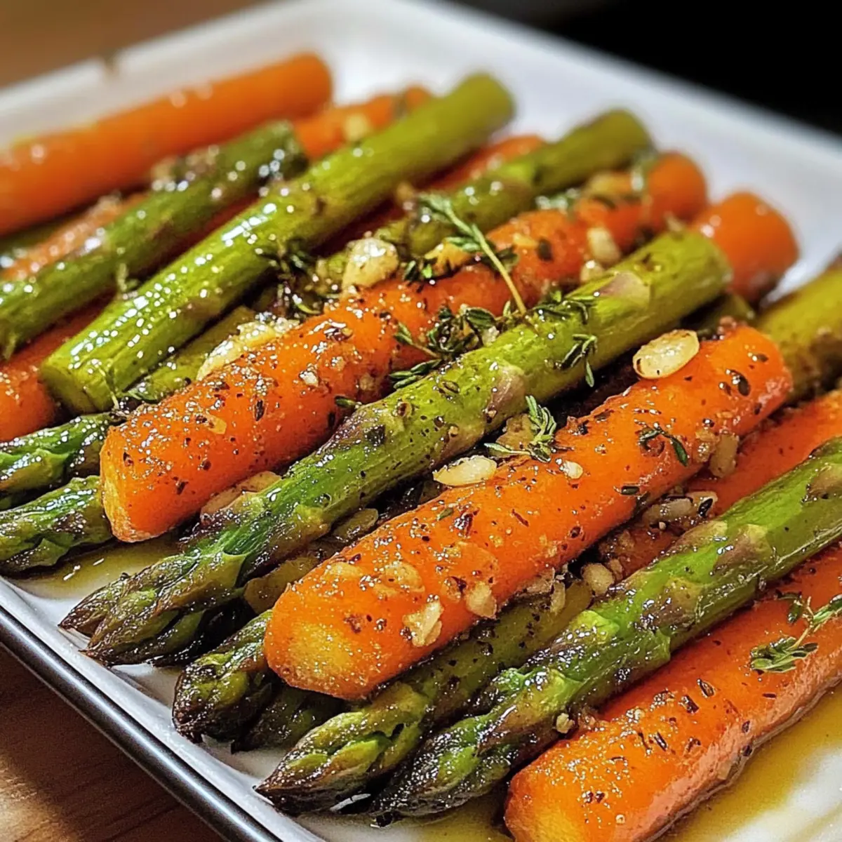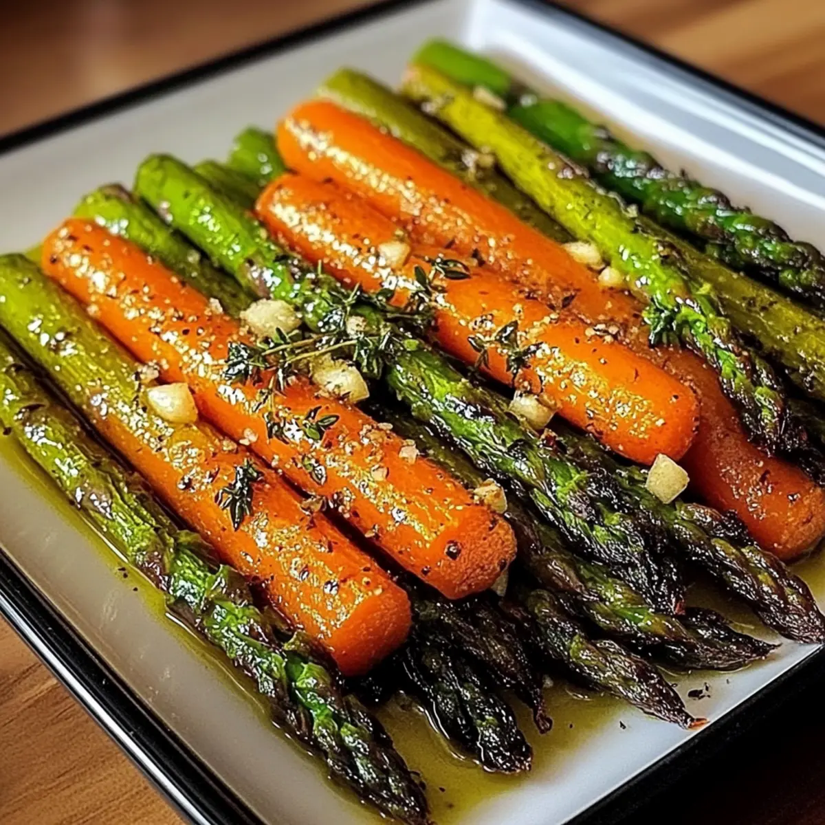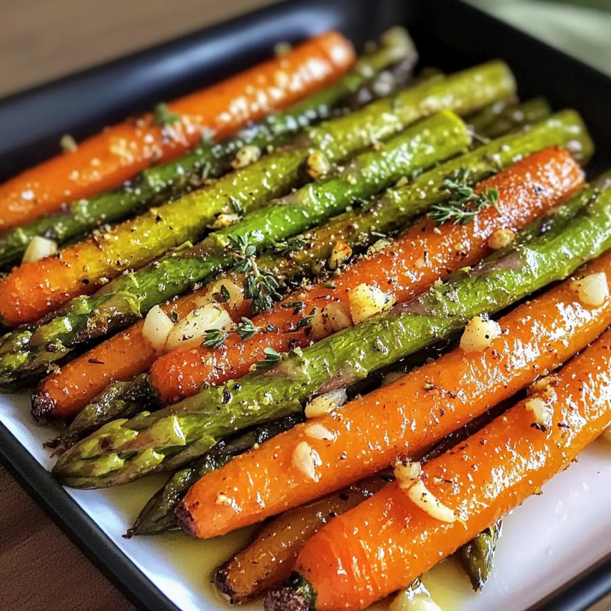 Sobald die Garzeit abgelaufen ist, nimm das Backblech aus dem Ofen. Für einen zusätzlichen Frischekick kannst du jetzt eine Prise Zitronenschale oder einen großzügigen Spritzer Balsamico-Glasur über das Gemüse geben. Serviere deinen Gerösteten Spargel & Karotten sofort und genieße die Aromen!