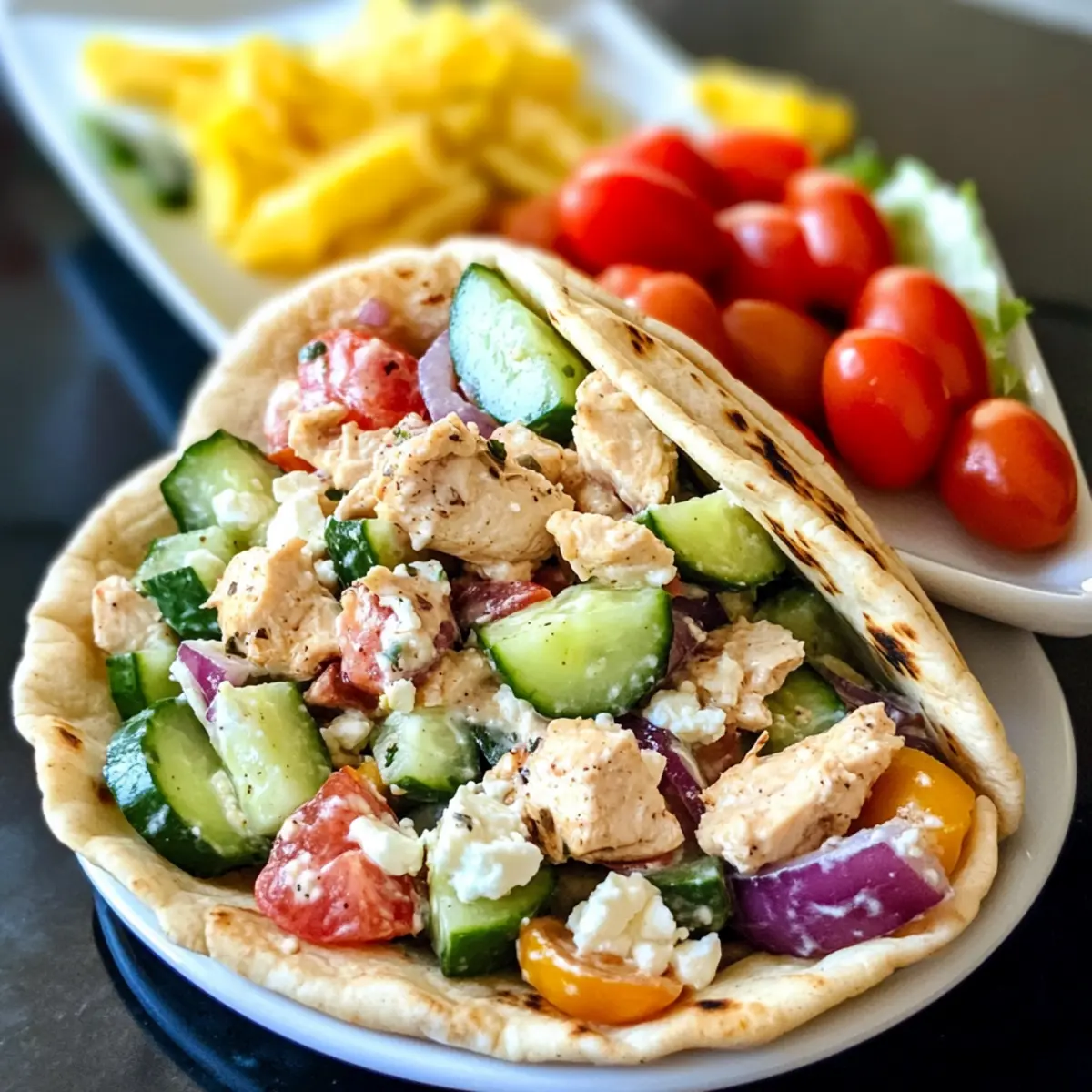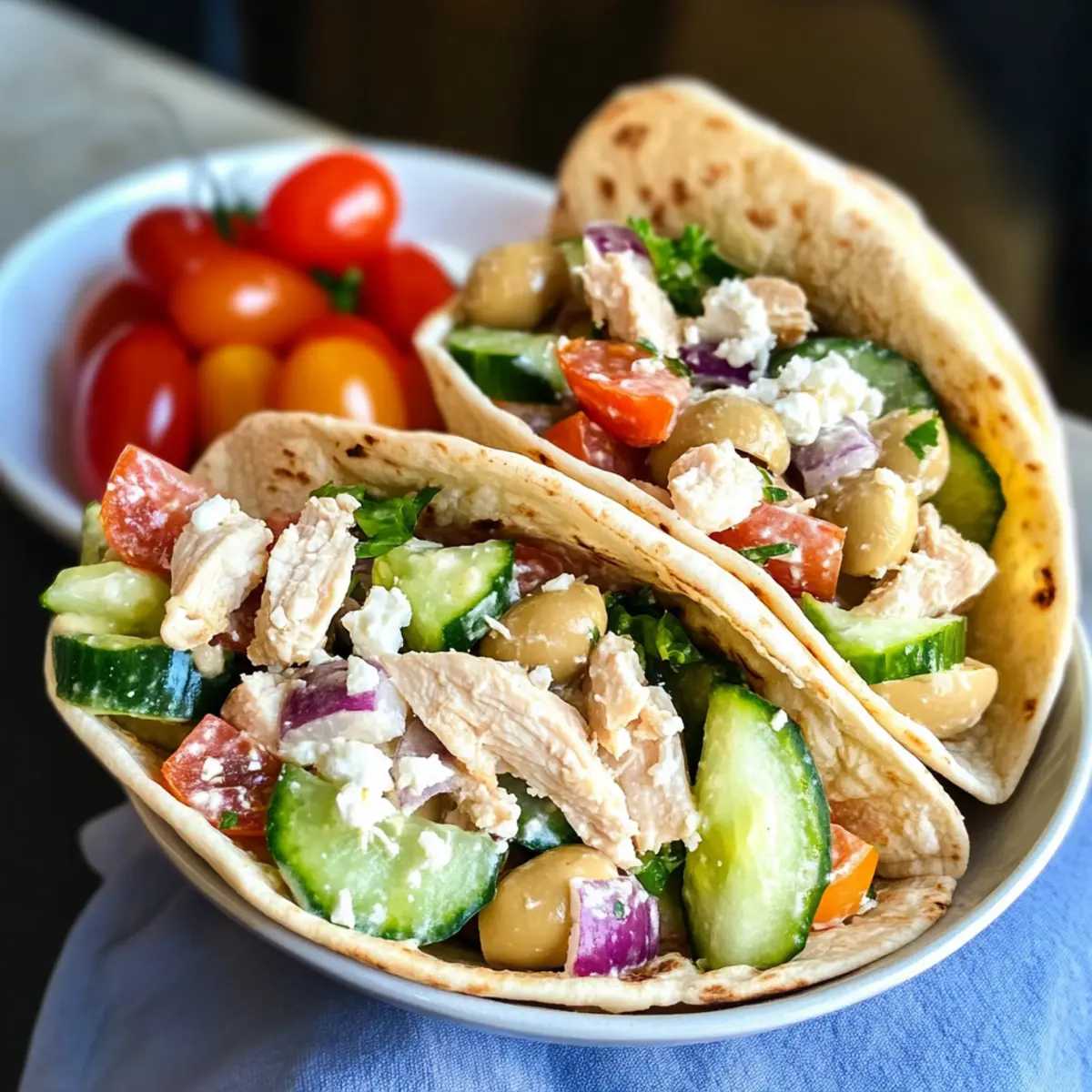 Während ich durch den staubigen Markt in Athen schlenderte, wurde ich von den frischen Aromen von Gewürzen, Oliven und dem verlockenden Duft gegrillten Hähnchens angezogen. Diese Erinnerungen kommen mir immer wieder in den Sinn, wenn ich meine Griechischen Hähnchensalat-Pitas zubereite. Diese unkomplizierte und schnelle Rezeptur vereint saftiges Hähnchen, knackige Gurken und cremigen Feta, was jede Mittagspause zu einem mediterranen Festmahl macht. Ideale für die Essensvorbereitung, sorgen diese Pitas dafür, dass du stets auf etwas Leckeres und Gesundes freuen kannst. Bereit, deinen nächsten Lunch-Hit zu entdecken? Lass uns gemeinsam diese köstliche Geschmacksexplosion im Handumdrehen zubereiten!