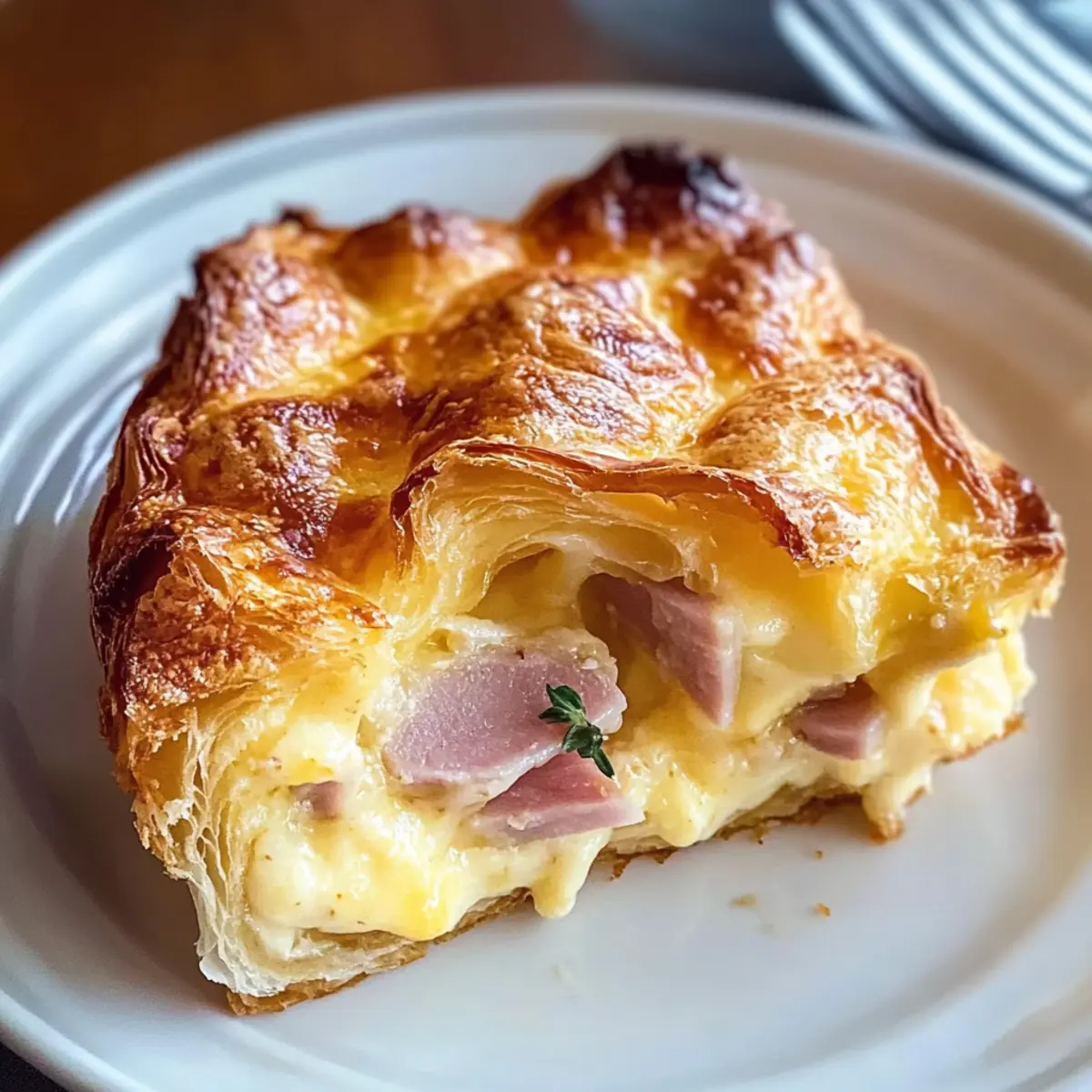 Sinnlicher Genuss: Das zarte, flakey Croissant harmoniert perfekt mit dem geschmolzenen Gruyère-Käse und dem herzhaften Schinken. Eine Geschmackskombination, die niemand widerstehen kann!