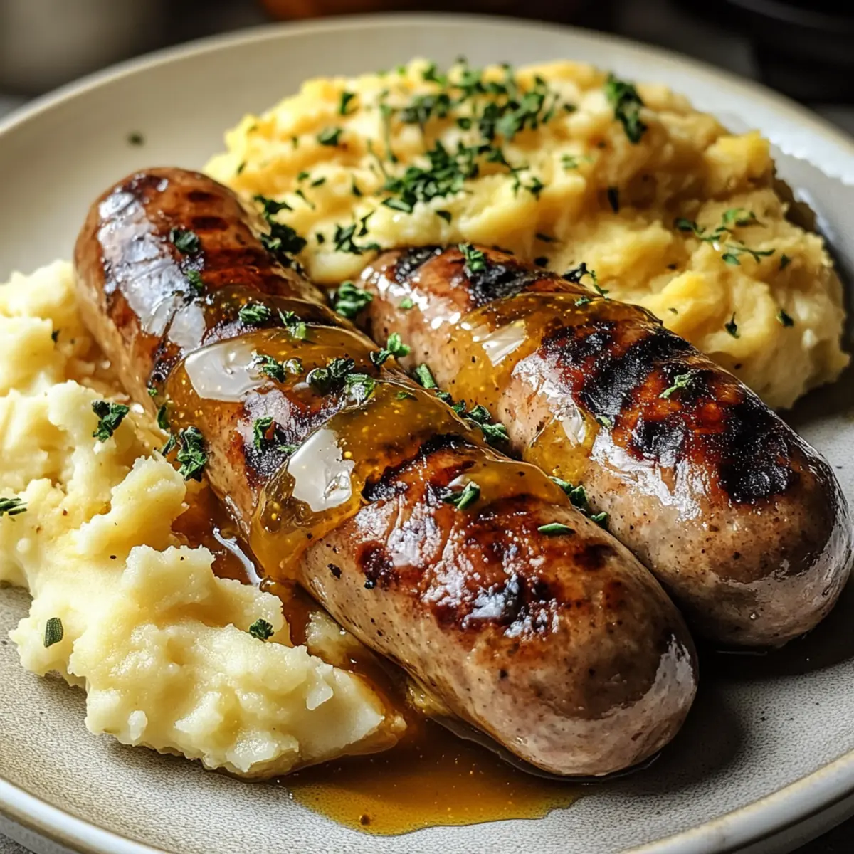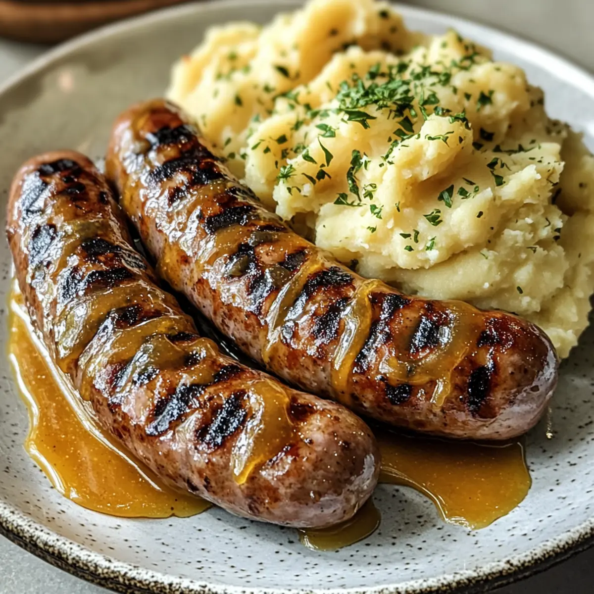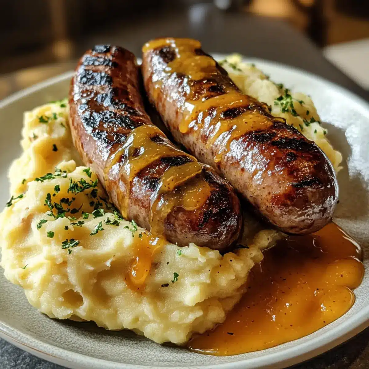Hasselback-Bratwürste mit Honigsenf und Kartoffelpüree