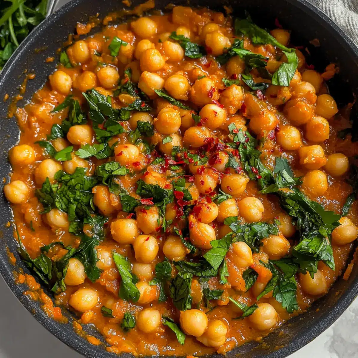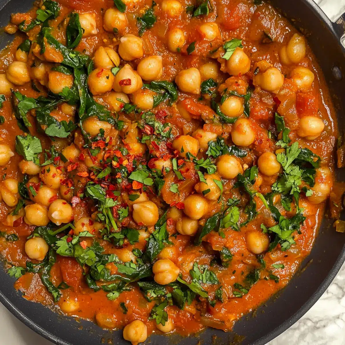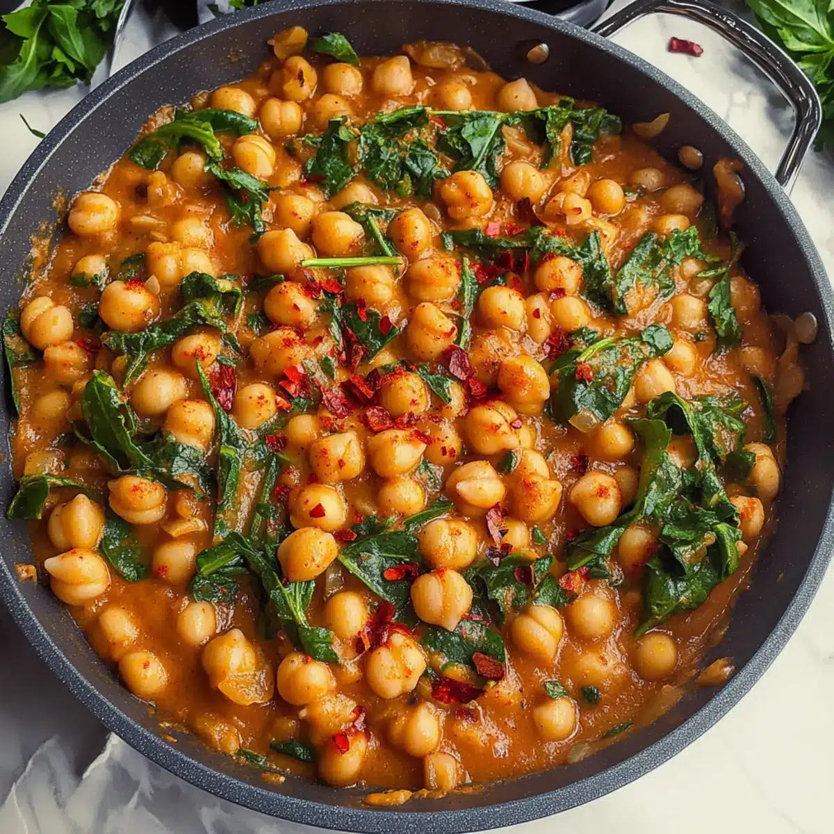 Nehme die Pfanne vom Herd und füge eine Handvoll frischen Spinat oder Basilikum hinzu. Rühre die grünen Blätter unter, bis sie leicht verwelkt sind und ihre Farbe intensivieren. Dies verleiht den Heirate mich Kichererbsen nicht nur eine frische Note, sondern erhöht auch den Nährwert des Gerichts.