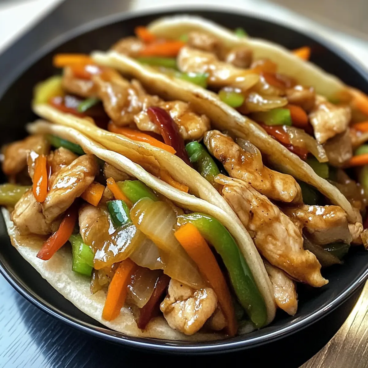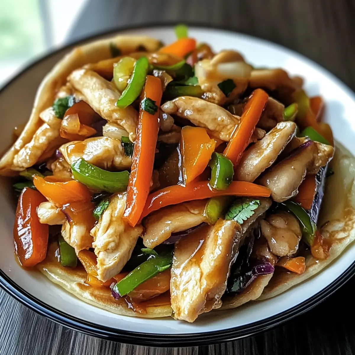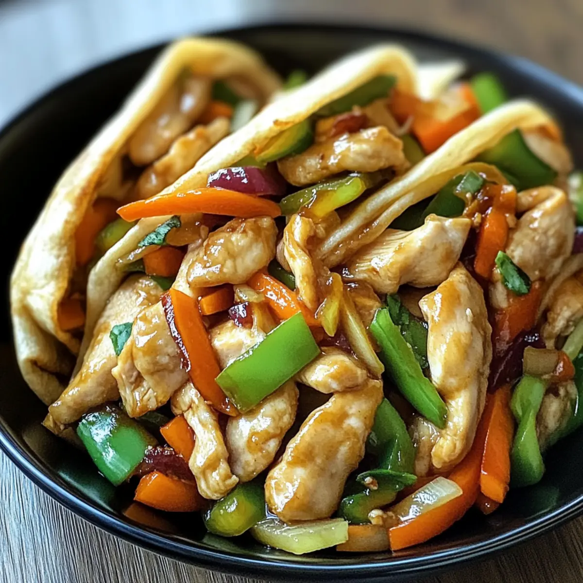 - Wraps füllen und servieren: Warmen Mandarin-Pfannkuchen oder Tortillas mit der Hühnchen-Gemüse-Mischung füllen und servieren.