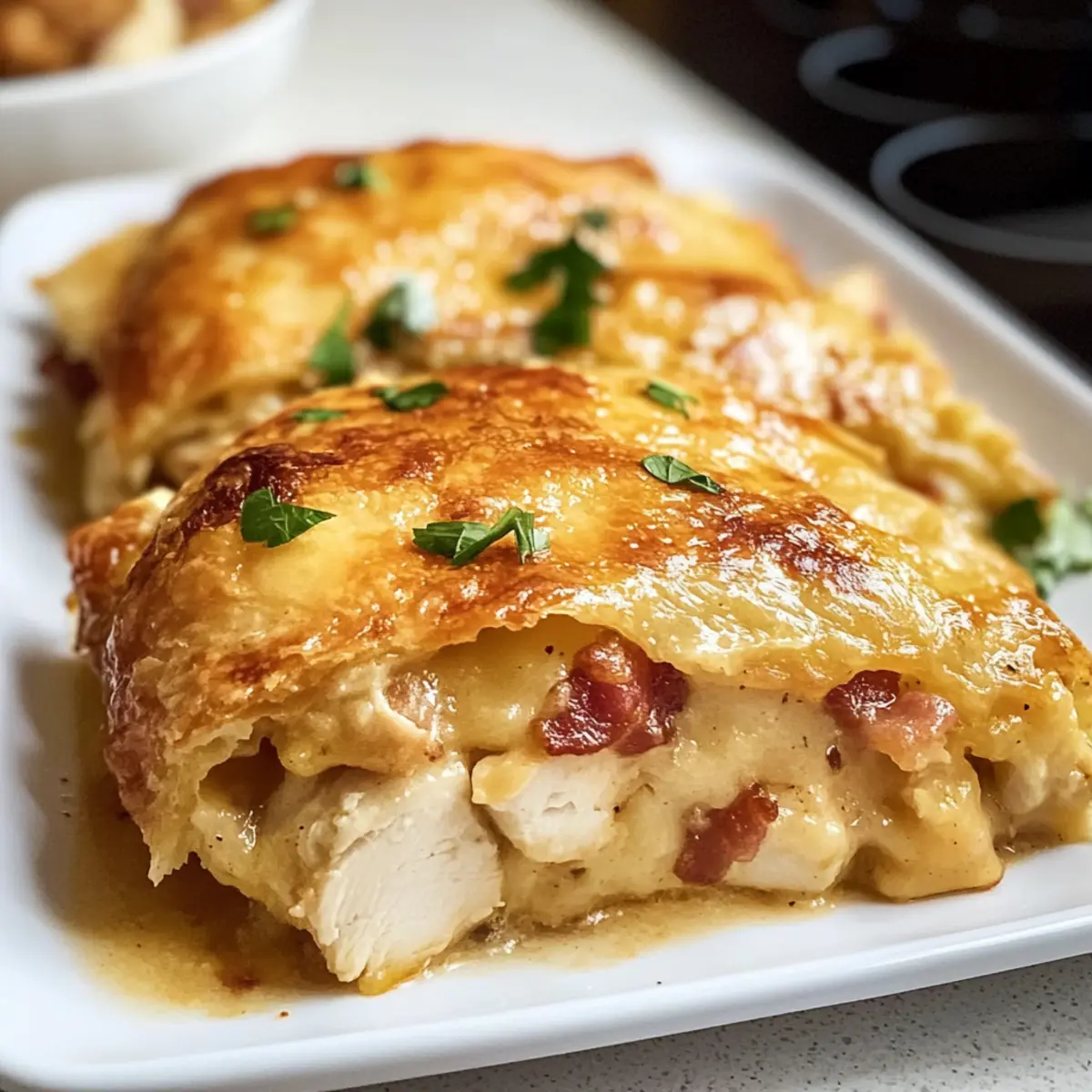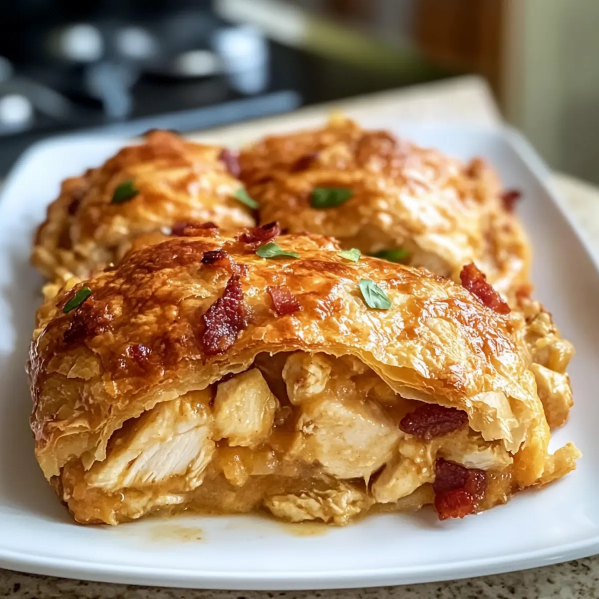 Perfekte Textur: Der knusprige Teig umhüllt eine cremige, reichhaltige Füllung aus Käse, Hähnchen und Speck, die den Gaumen verwöhnt.