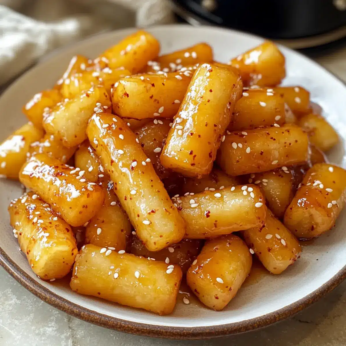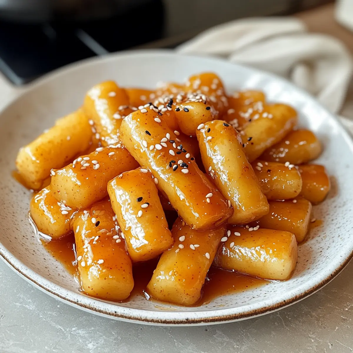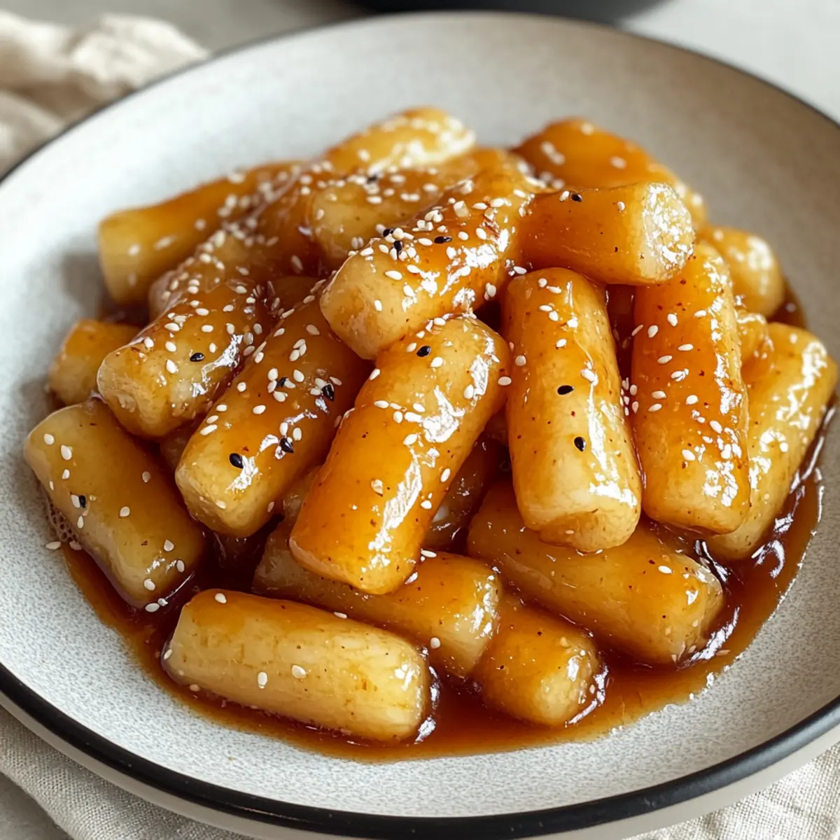 - Serviere die Honigbutter Tteokbokki heiß, garniere mit Sesamsamen.
