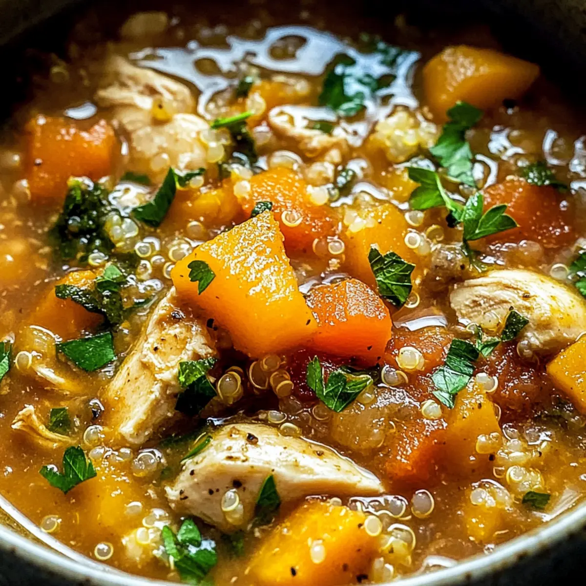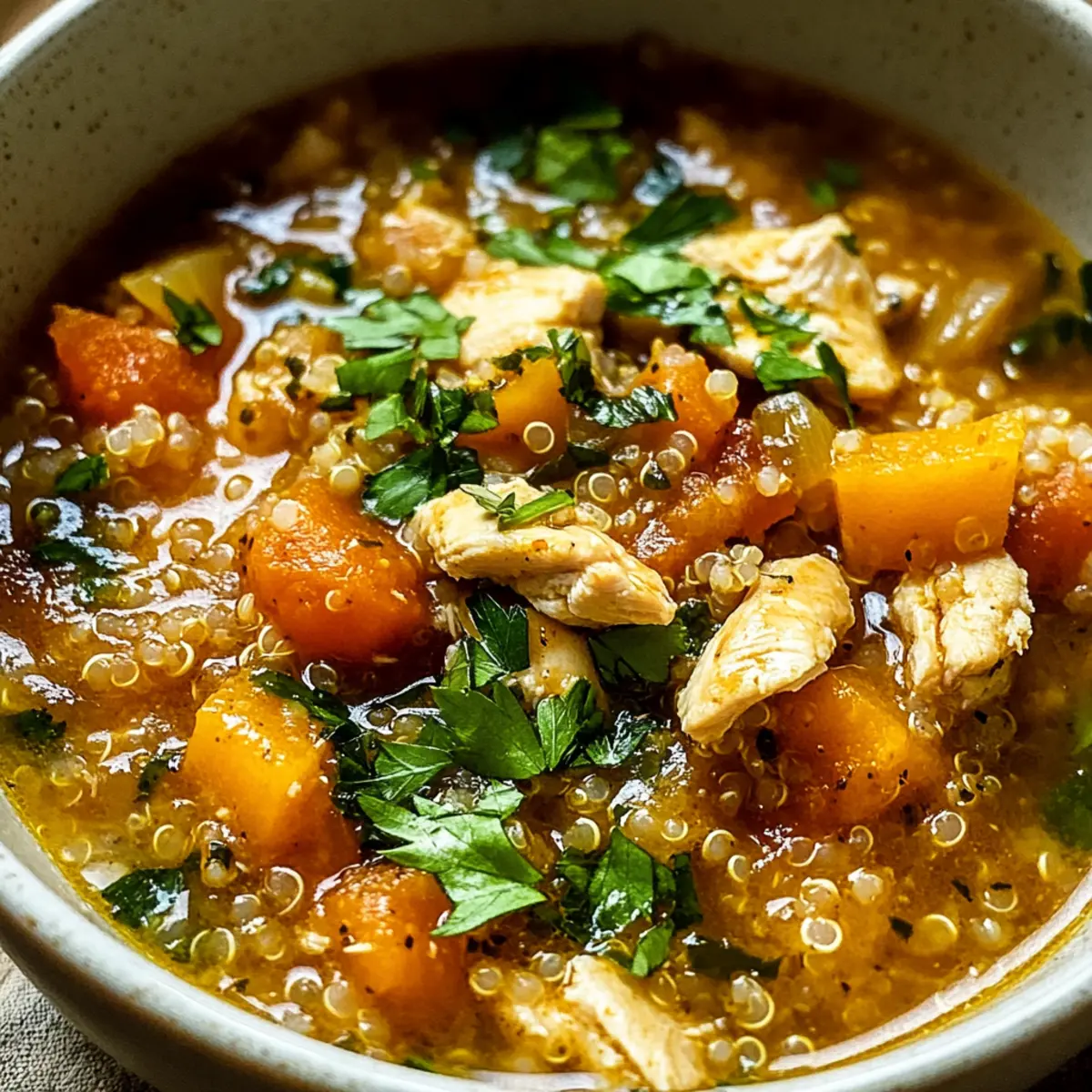- Serviere den Hühnereintopf mit Quinoa und Kürbis heiß in Schalen und garniere jede Portion mit frisch gehackter Petersilie.