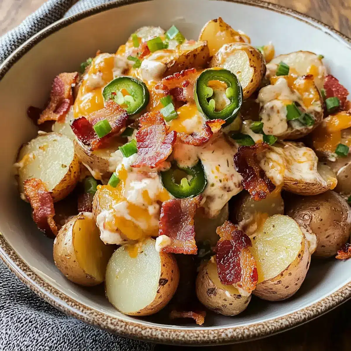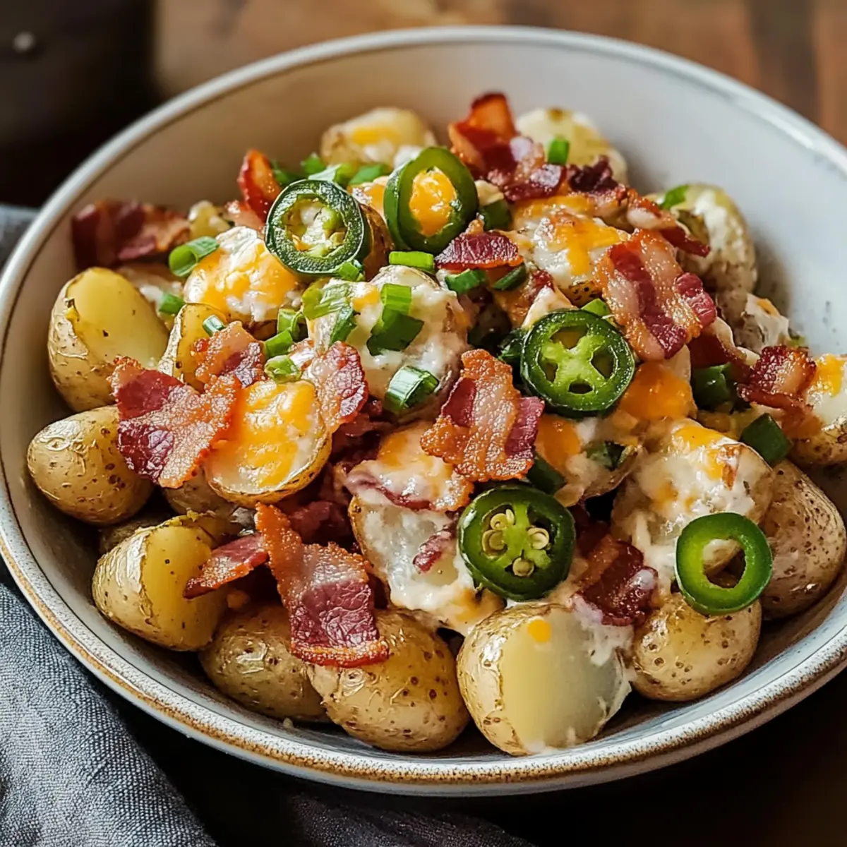 Für den perfekten Jalapeño-Popper-Röstkartoffelsalat empfehle ich, festkochende Sorten wie Yukon Gold oder rote Kartoffeln zu verwenden. Diese behalten beim Rösten ihre Form und bieten einen reichhaltigen Geschmack. Vermeide mehligkochende Kartoffeln, da sie nach dem Rösten eine matschige Konsistenz bekommen können. Wähle die Kartoffeln, die glatt und fest sind, ohne dunkle Flecken oder Risse.