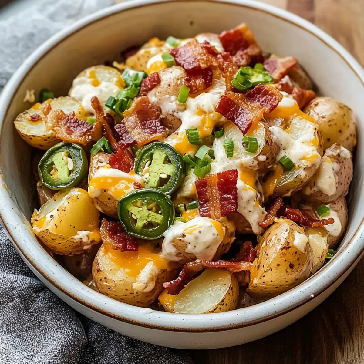 Es war ein sonniger Nachmittag, und die Grillparty stand vor der Tür. Plötzlich hatte ich das Gefühl, dass eine einfache Kartoffelsalat-Variation nicht ausreichen würde. Das Ergebnis? Ein köstlicher Jalapeño-Popper-Röstkartoffelsalat, der alles verändert. Diese Mischung aus knusprig gerösteten Kartoffeln und einer cremigen, würzigen Sauce bringt nicht nur die perfekten Aromen zusammen, sondern fügt auch die aufregende Schärfe frischer Jalapeños hinzu – ideal für alle, die Abwechslung lieben! Außerdem ist dieses Gericht unglaublich anpassbar: Du kannst es ganz nach deinem Geschmack gestalten, sei es als scharfe Delikatesse oder in einer leichteren Version. Perfekt für jede Zusammenkunft oder auch einfach zum Genießen auf der Couch – bereiten wir uns darauf vor, dass die klassischen Beilagen in den Schatten gestellt werden! Was hältst du von dieser kreativen Abwandlung?