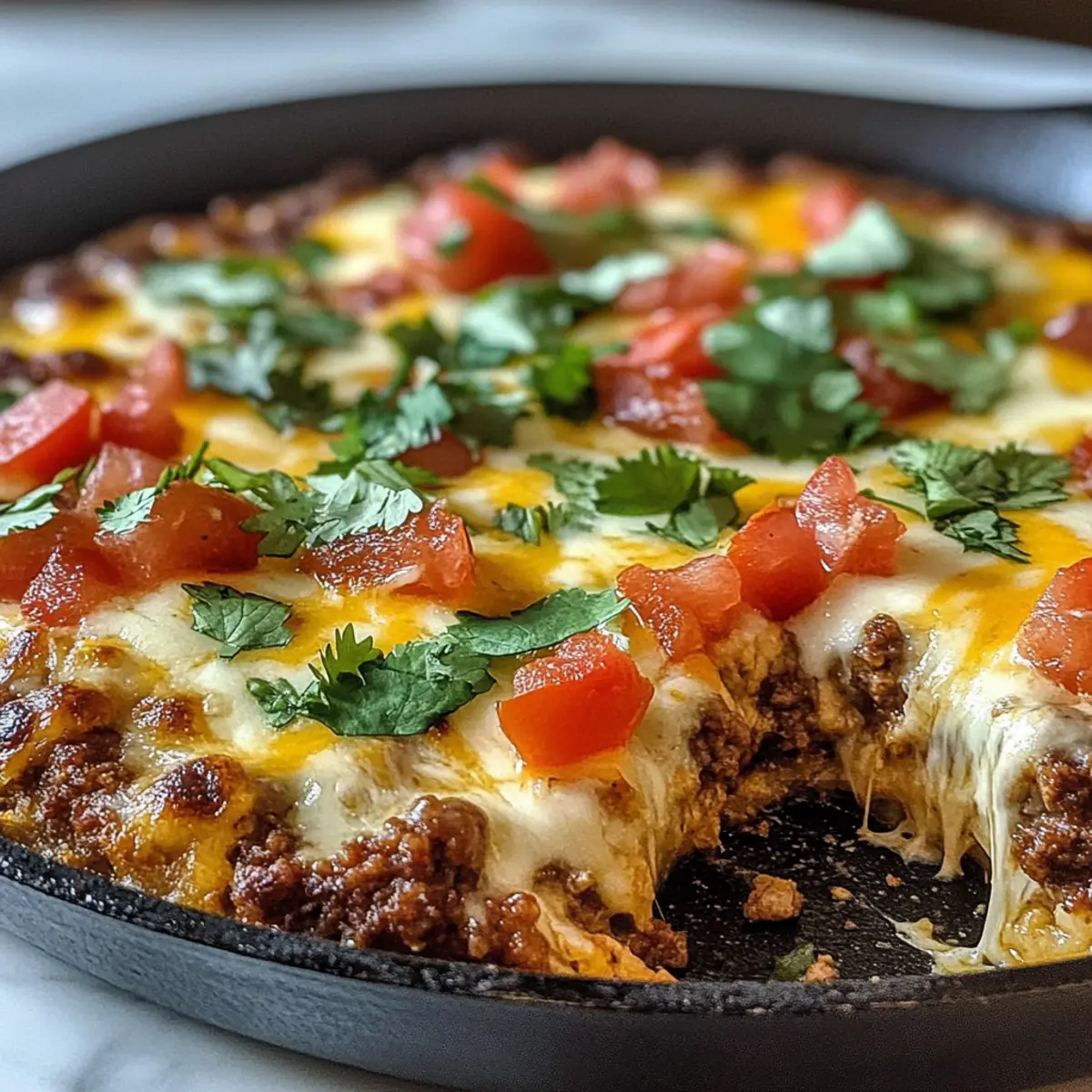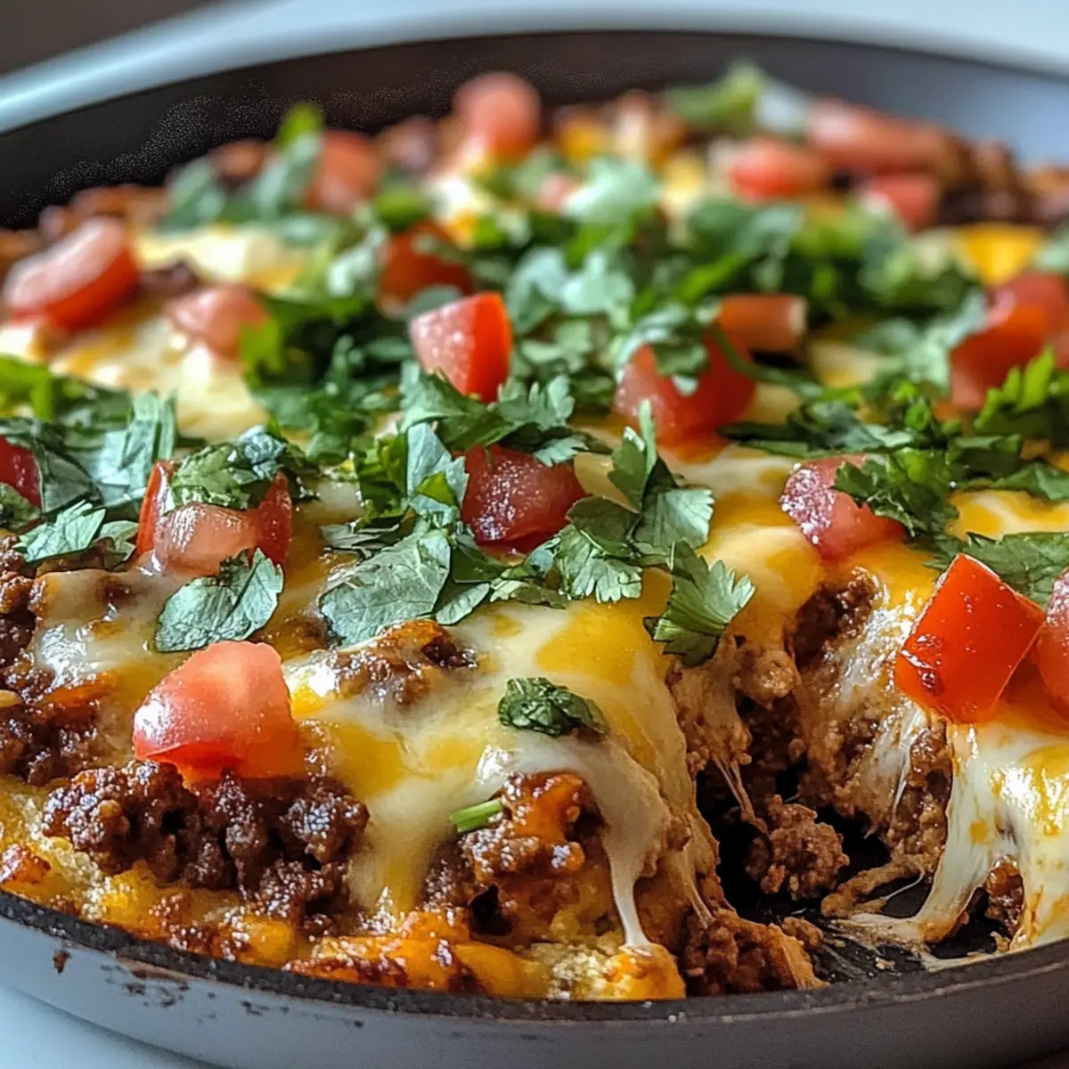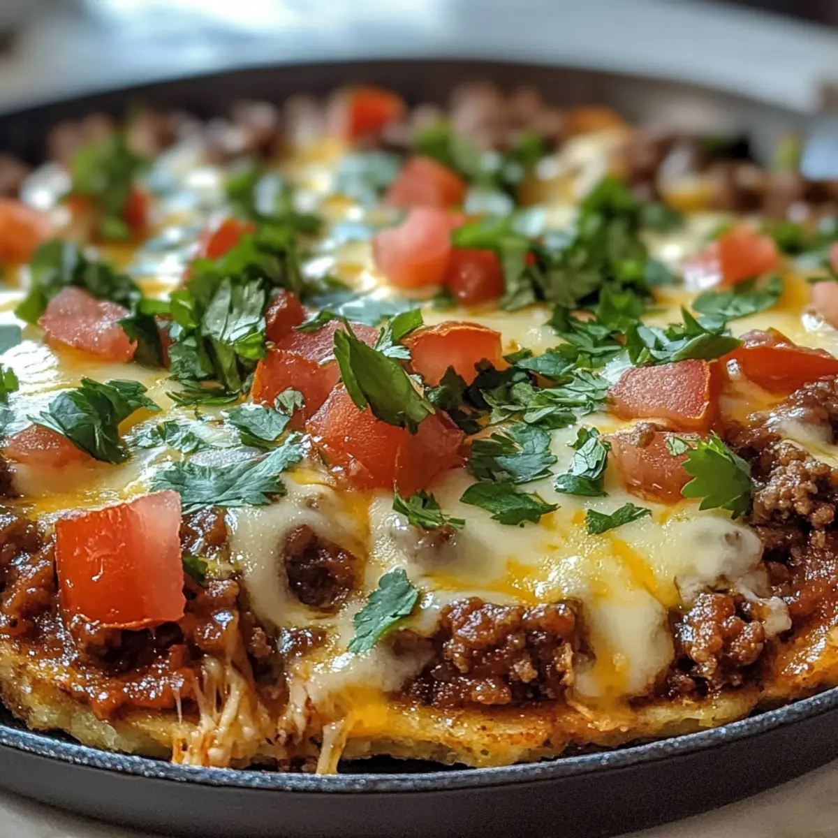 Nimm die Käse-Blumenkohlboden Taco-Pfanne aus dem Ofen und garniere sie nach Belieben mit frischen Tomaten, Koriander und einem Klecks Sauerrahm. Serviere das Gericht warm und genieße die vielfältigen Aromen dieser gesunden Taco-Variante!