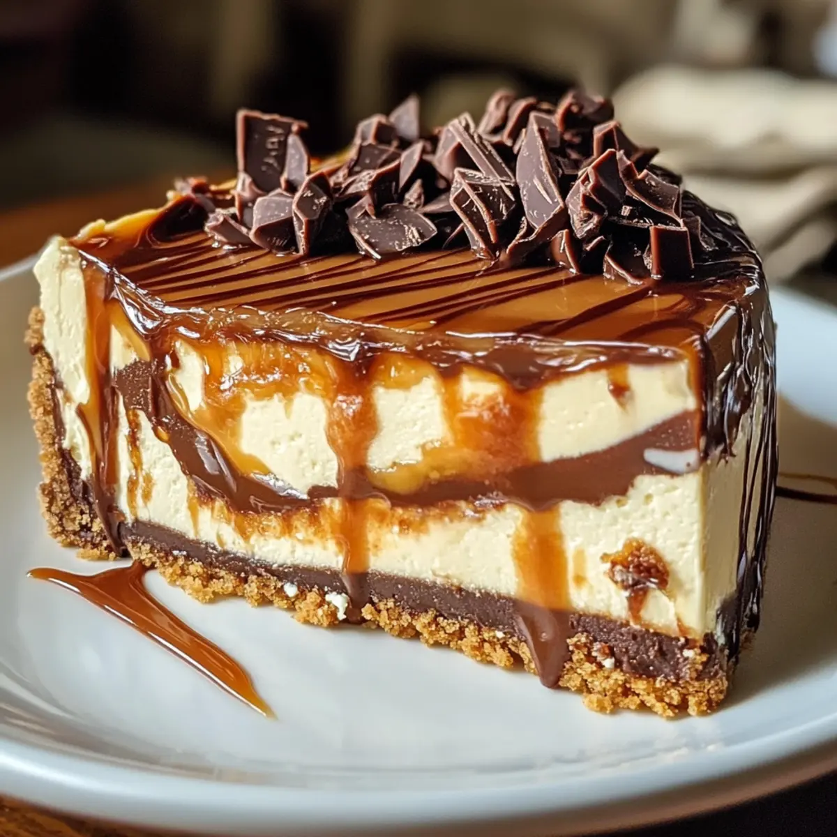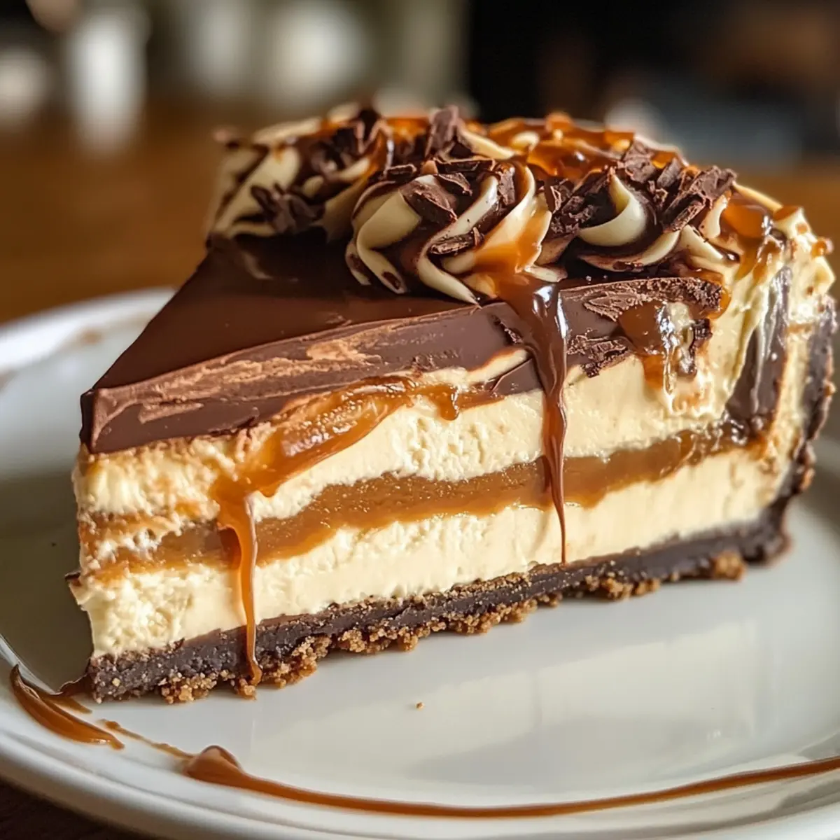 - Dekorieren Sie den Käsekuchen vor dem Servieren mit Schlagsahne und zusätzlicher Karamellsauce.