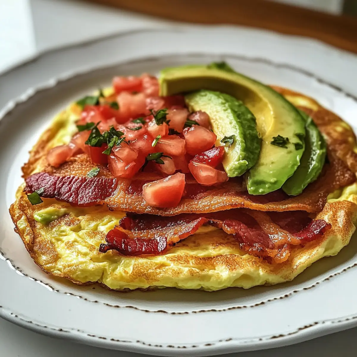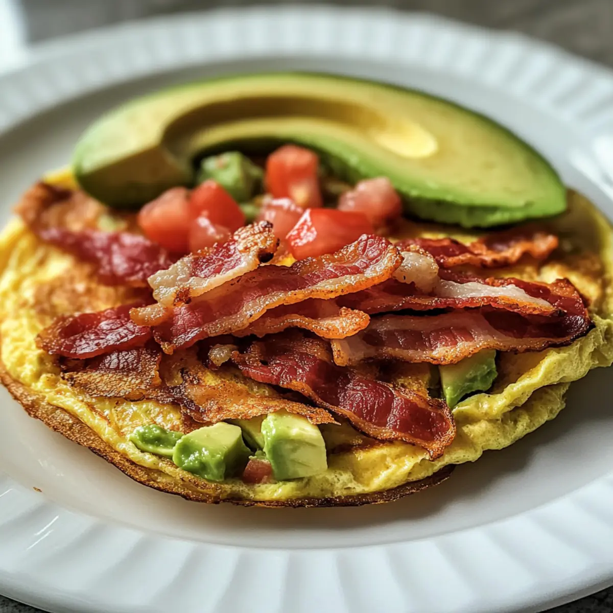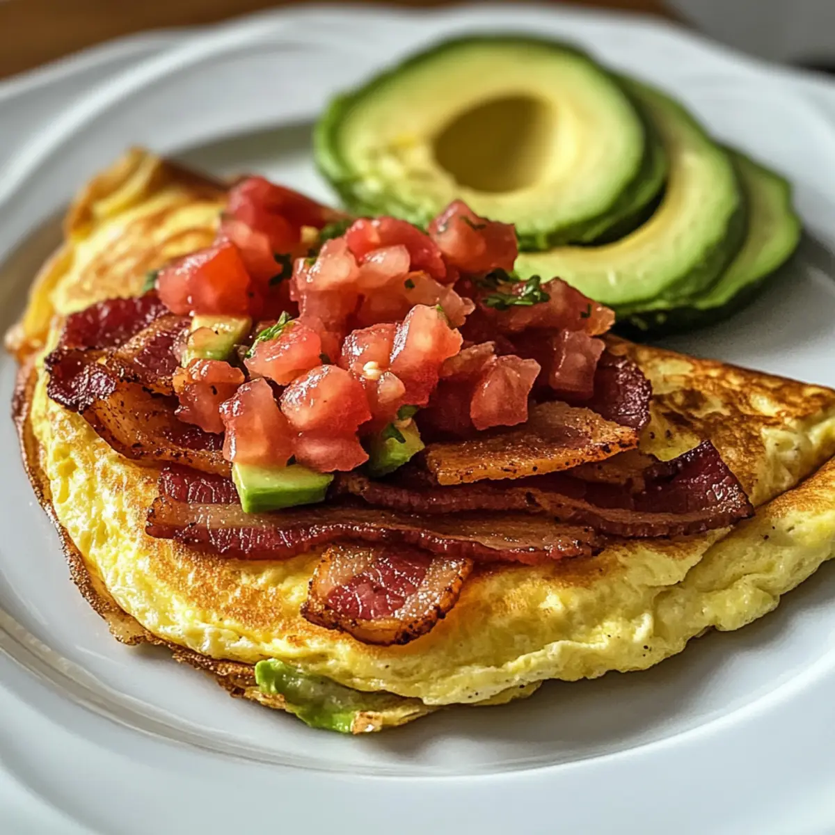 - Belegt eine Hälfte des Omeletts mit knusprigem Räucherspeck, frischer Tomatensalsa und cremiger Avocado.
