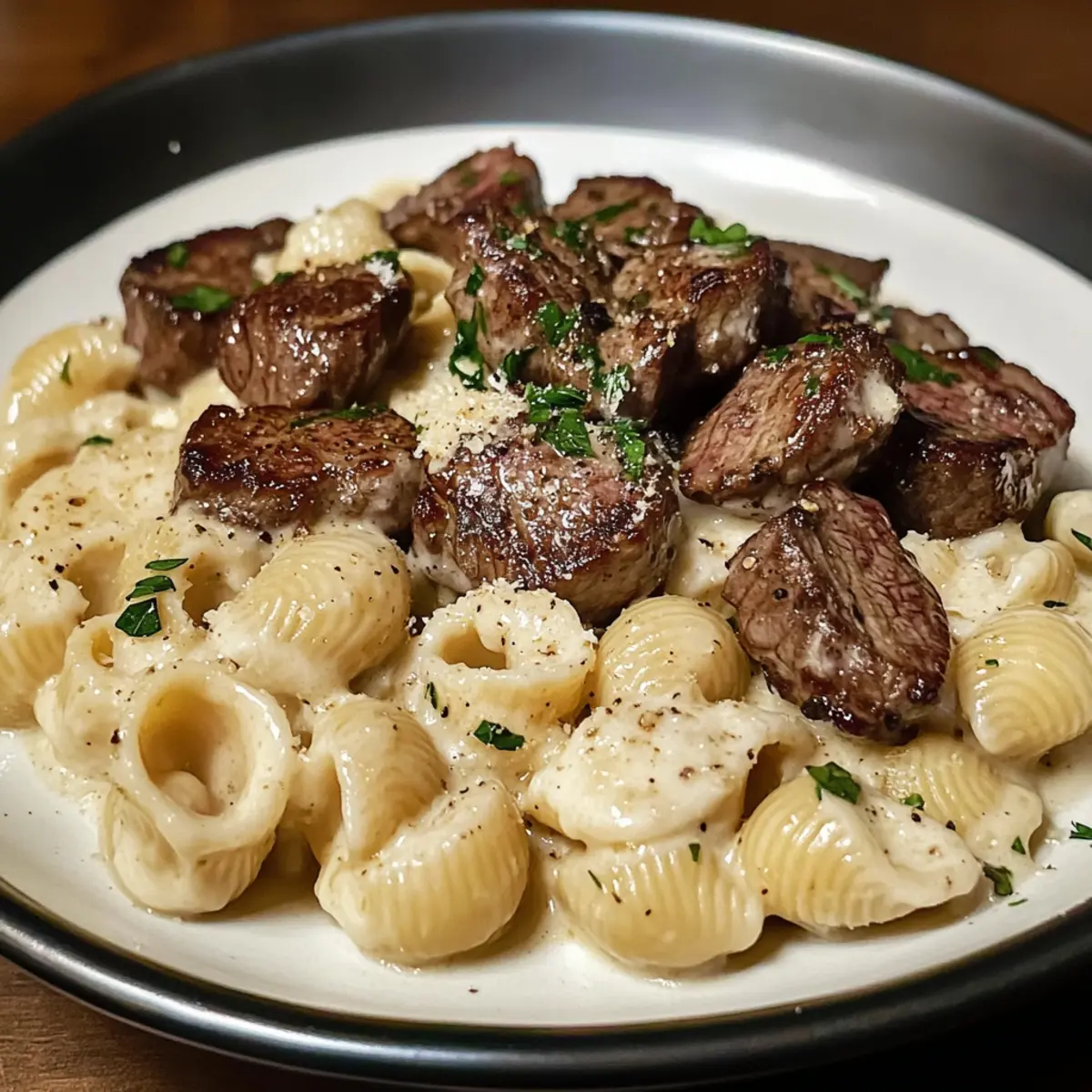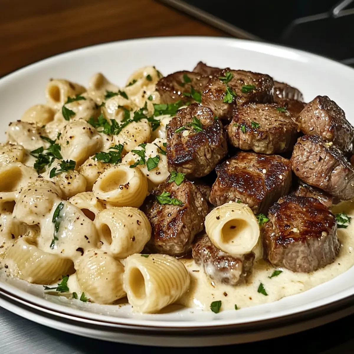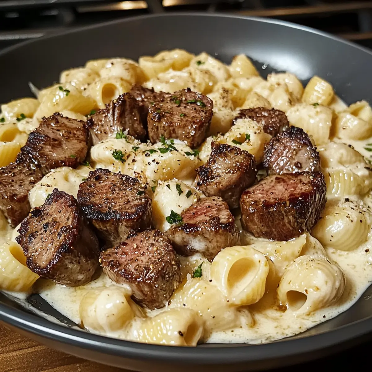 Tolle Konsistenz: Die saftigen Steakbissen treffen auf die cremige Textur der Alfredo-Schalen, wodurch dieses Gericht zu einem echten Genuss wird.