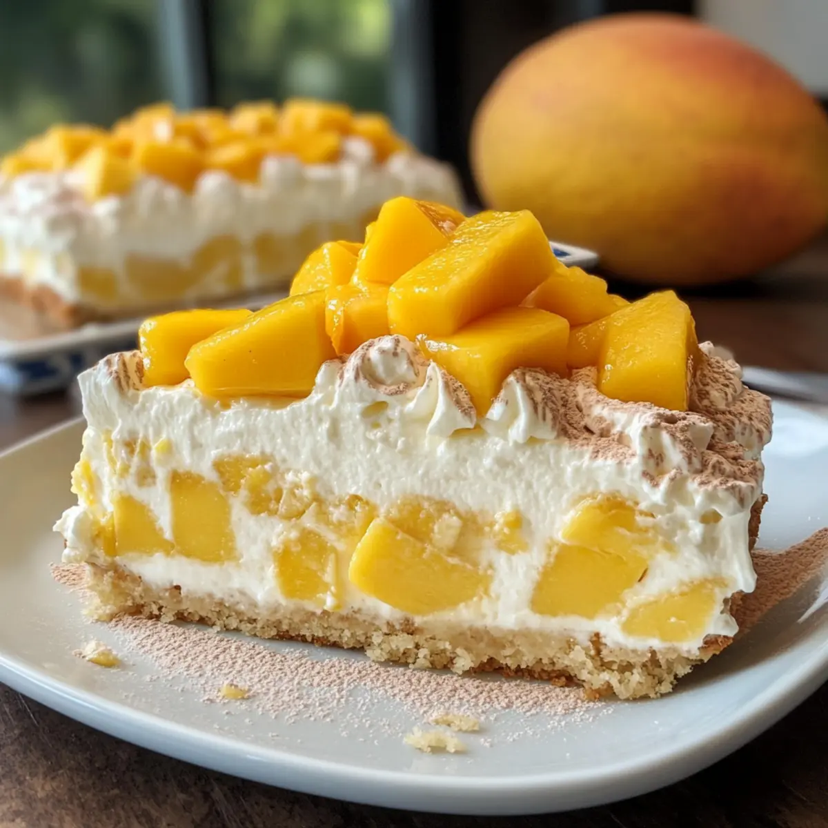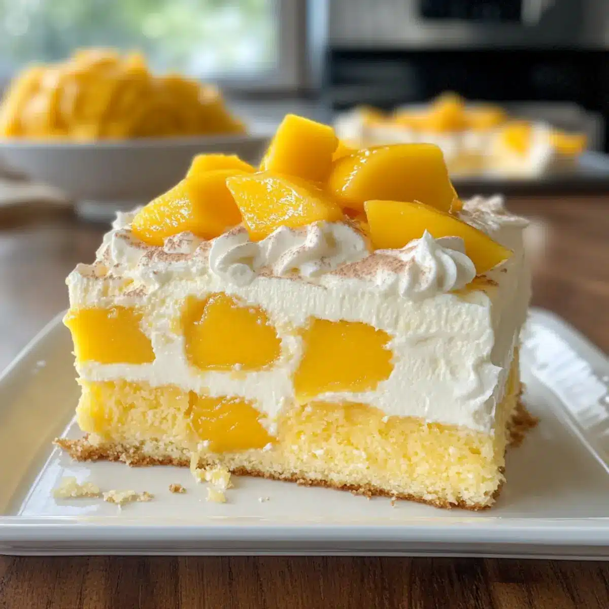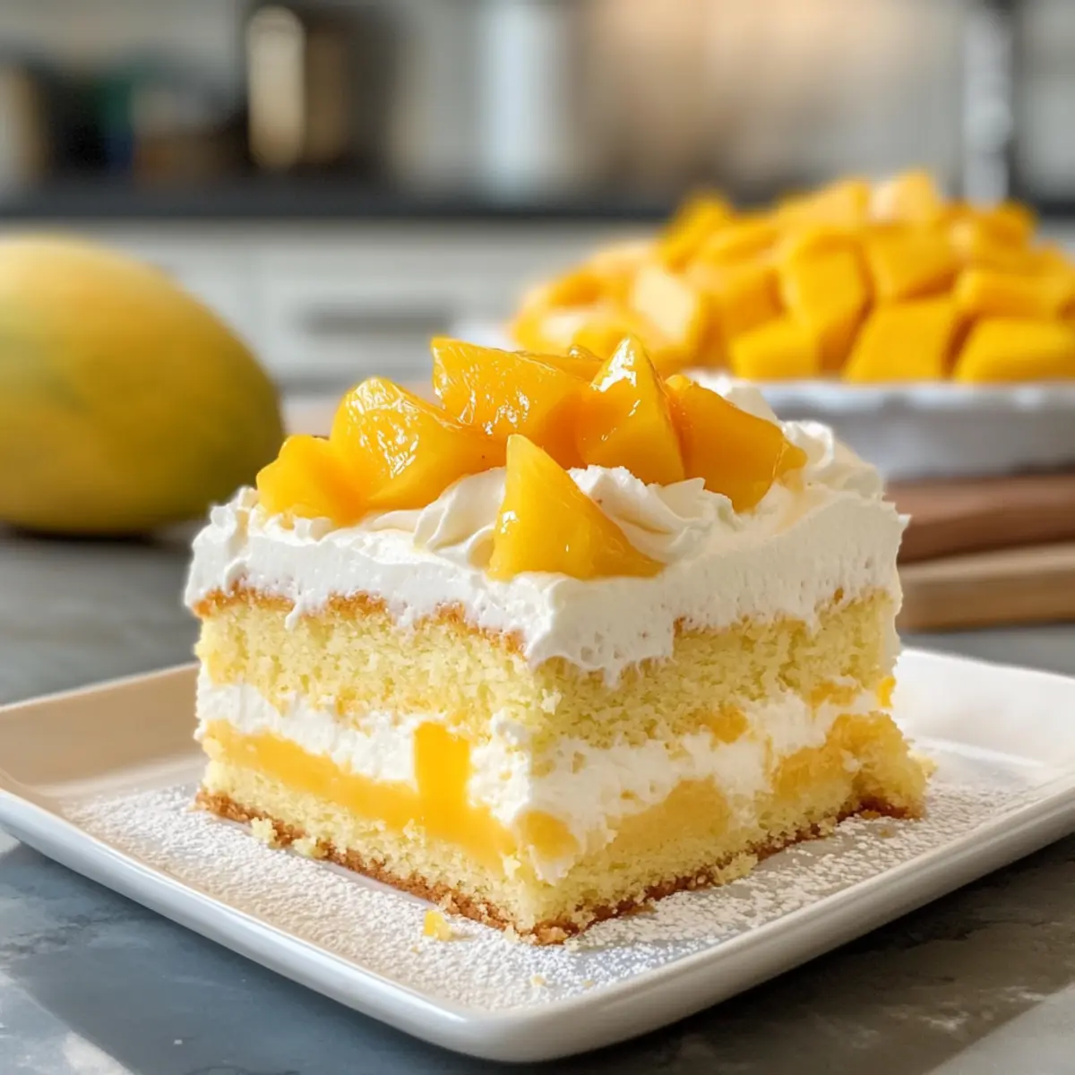 - Kuchen dekorieren: Geschlagene Sahne über den Kuchen verteilen und mit frischen Mangoscheiben dekorieren.