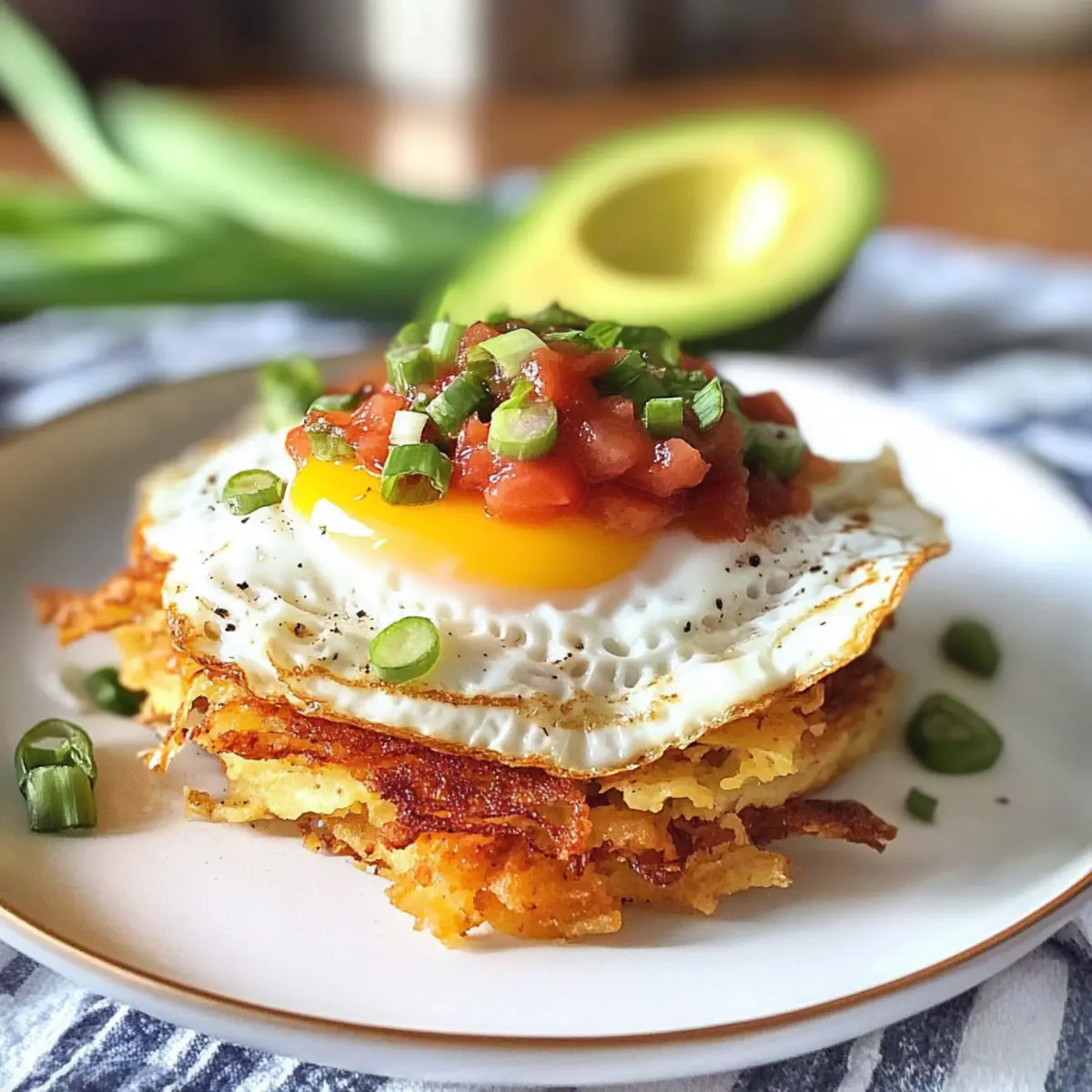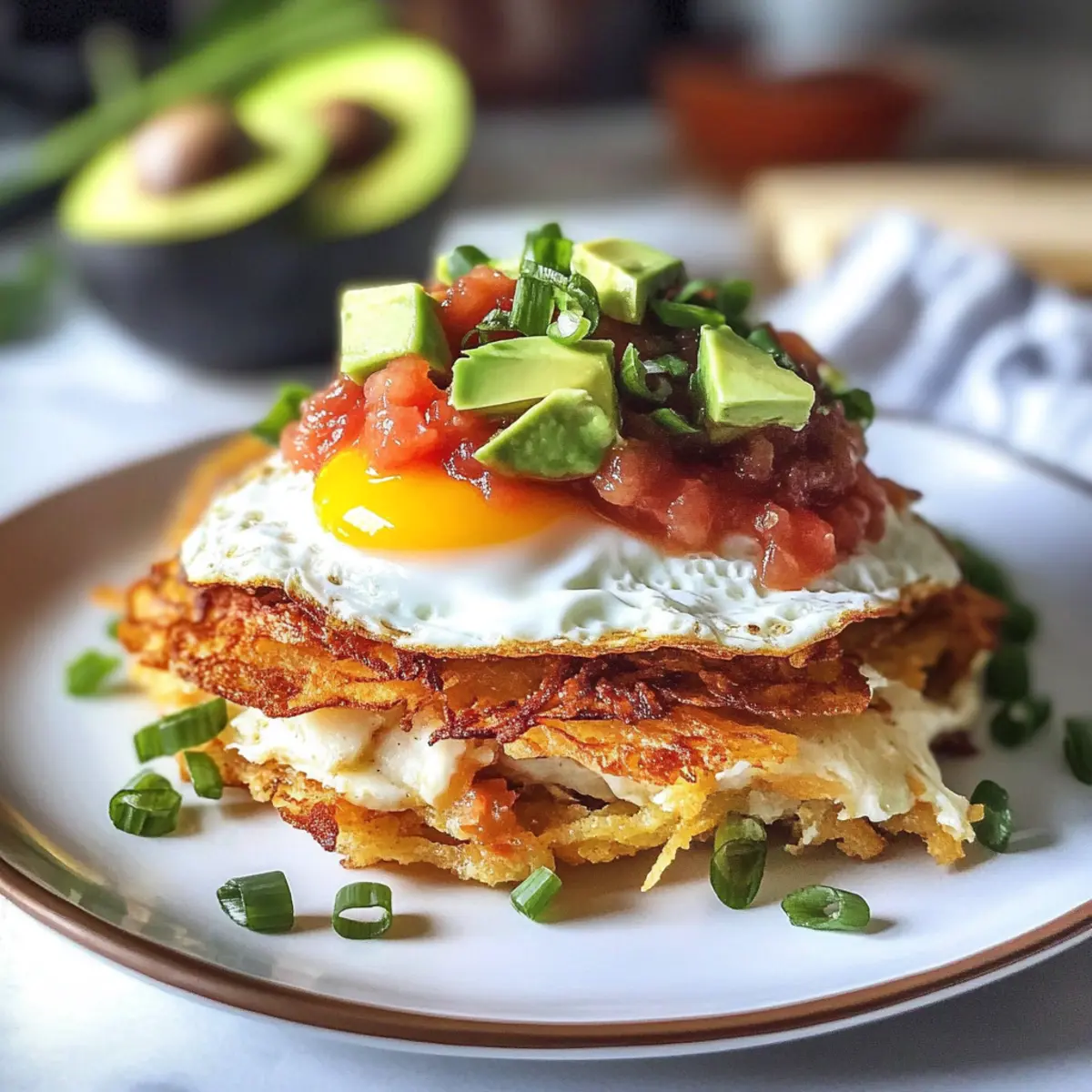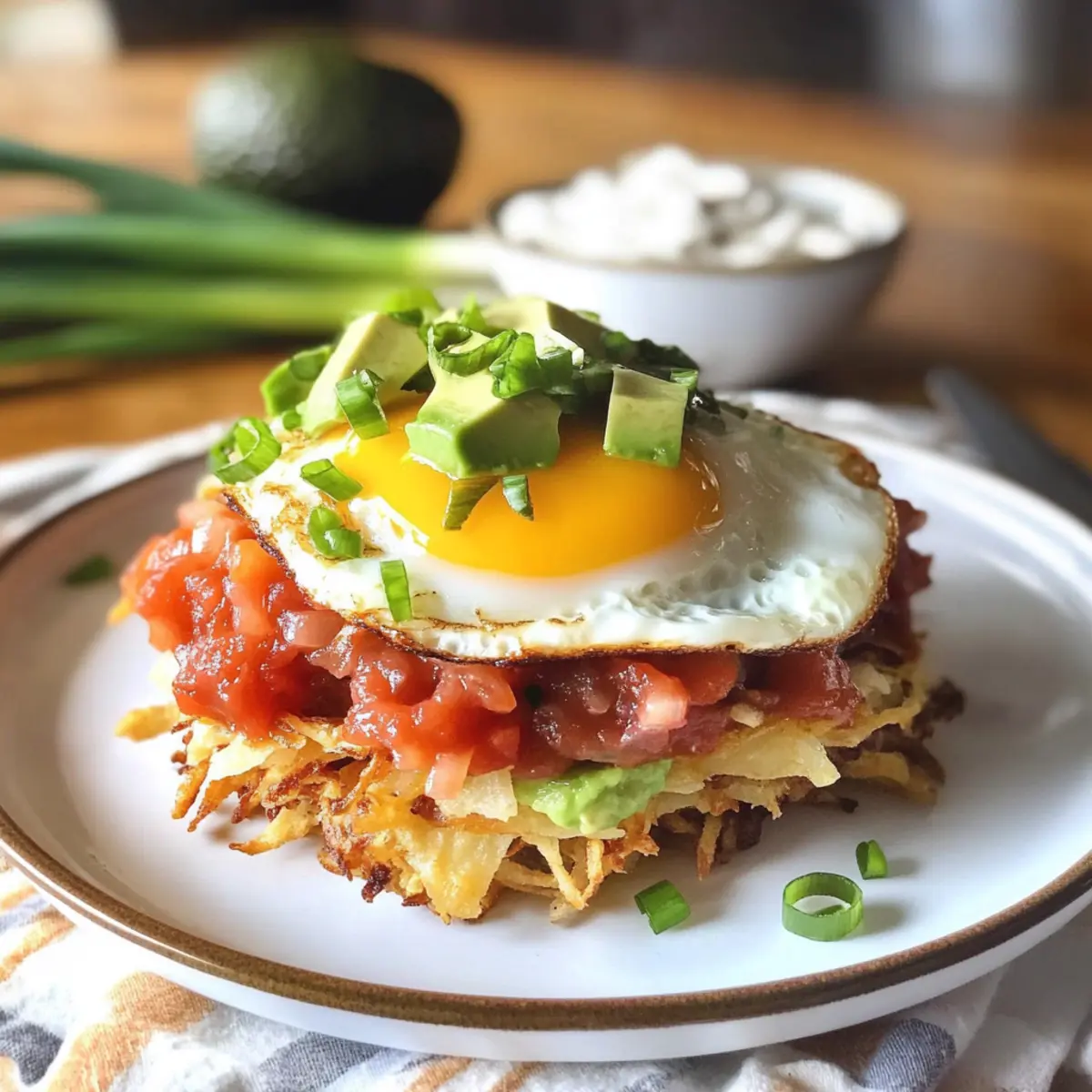 Beginnen Sie mit einer goldbraunen Rosti als Basis, darauf kommt ein gebratenes Ei. Toppen Sie es mit Bacon Bits, Salsa, der gewürzten Avocado und der vorbereiteten Sour Cream. Fügen Sie nach Belieben noch mehr frische Frühlingszwiebeln hinzu, um einen Hauch von Farbe und Geschmack zu gewährleisten. Voilà, Ihre mexikanischen knusprigen Röstis sind servierbereit!