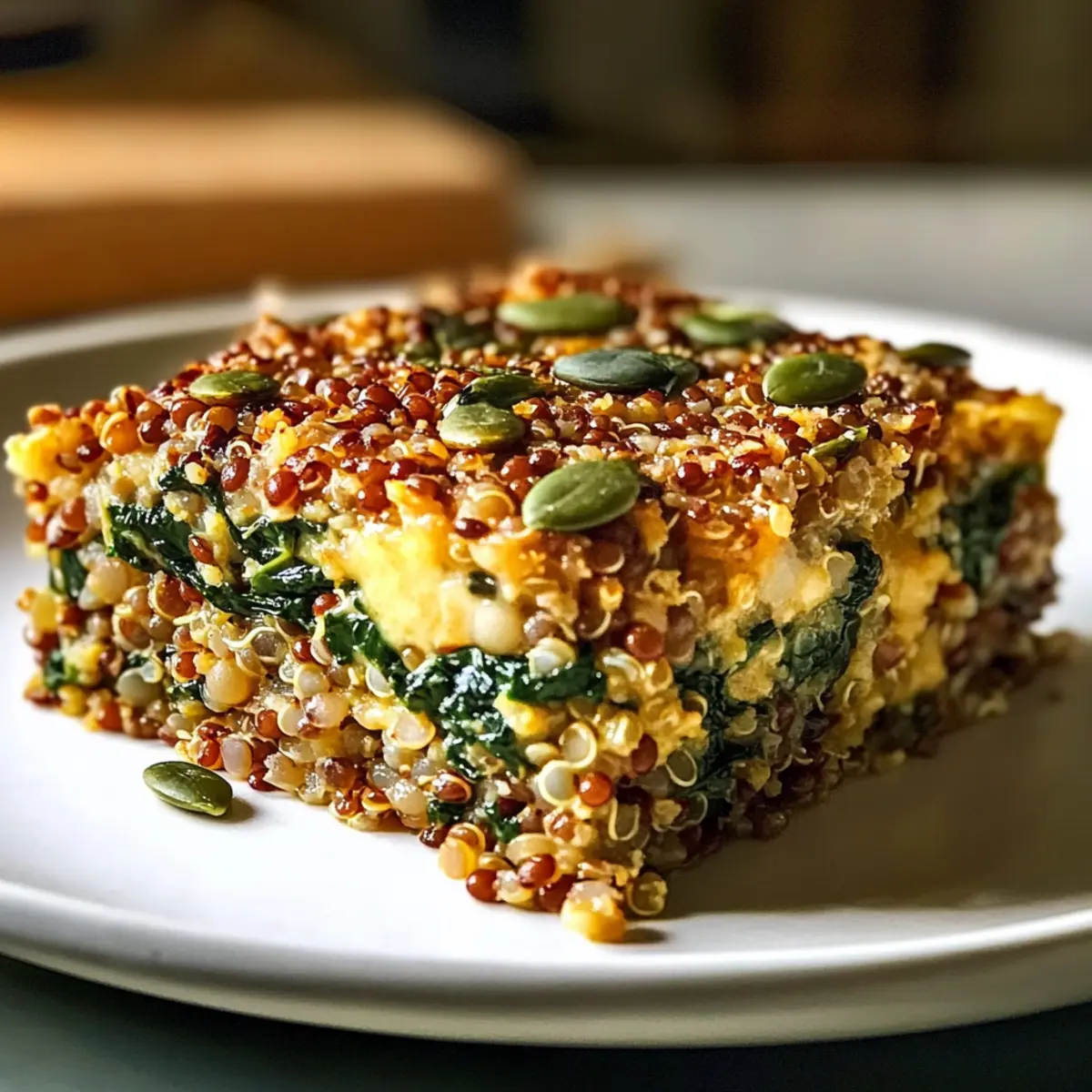 Streue 40 g Kürbiskerne über die Oberfläche der Mischung. Backe den Auflauf unbedeckt für weitere 10-15 Minuten, bis die Quinoa eine zarte Konsistenz erreicht hat und die Oberfläche leicht fest ist. Achte darauf, dass die Kanten des Auflaufs leicht gebräunt sind, um eine köstliche Textur zu erzielen.