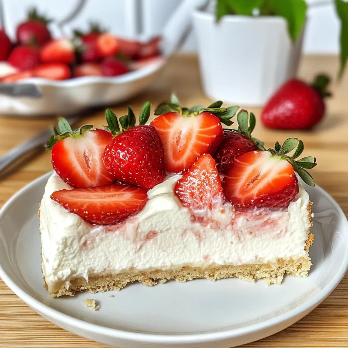 Nehmen Sie den Kuchen aus dem Kühlschrank und entfernen Sie vorsichtig den Rand der Springform. Verteilen Sie das Joghurt-Topping gleichmäßig auf der fest gewordenen Füllung. Schneiden Sie die Erdbeeren in Hälften oder Scheiben und dekorieren Sie den Kuchen nach Belieben. Verwenden Sie frische, saftige Erdbeeren, um den niedlichen und einladenden Look zu verstärken.