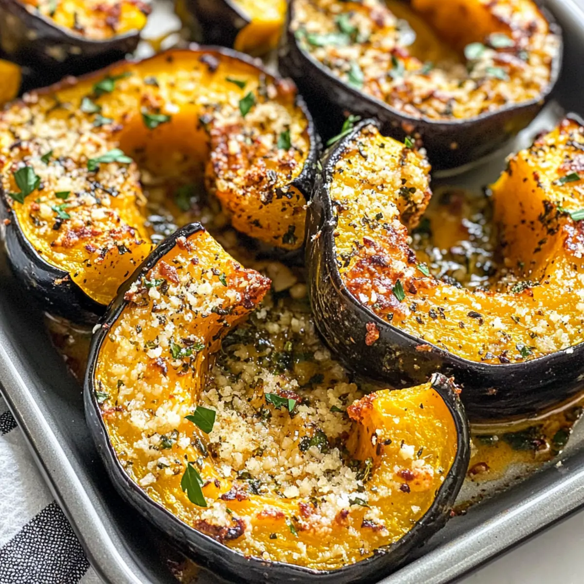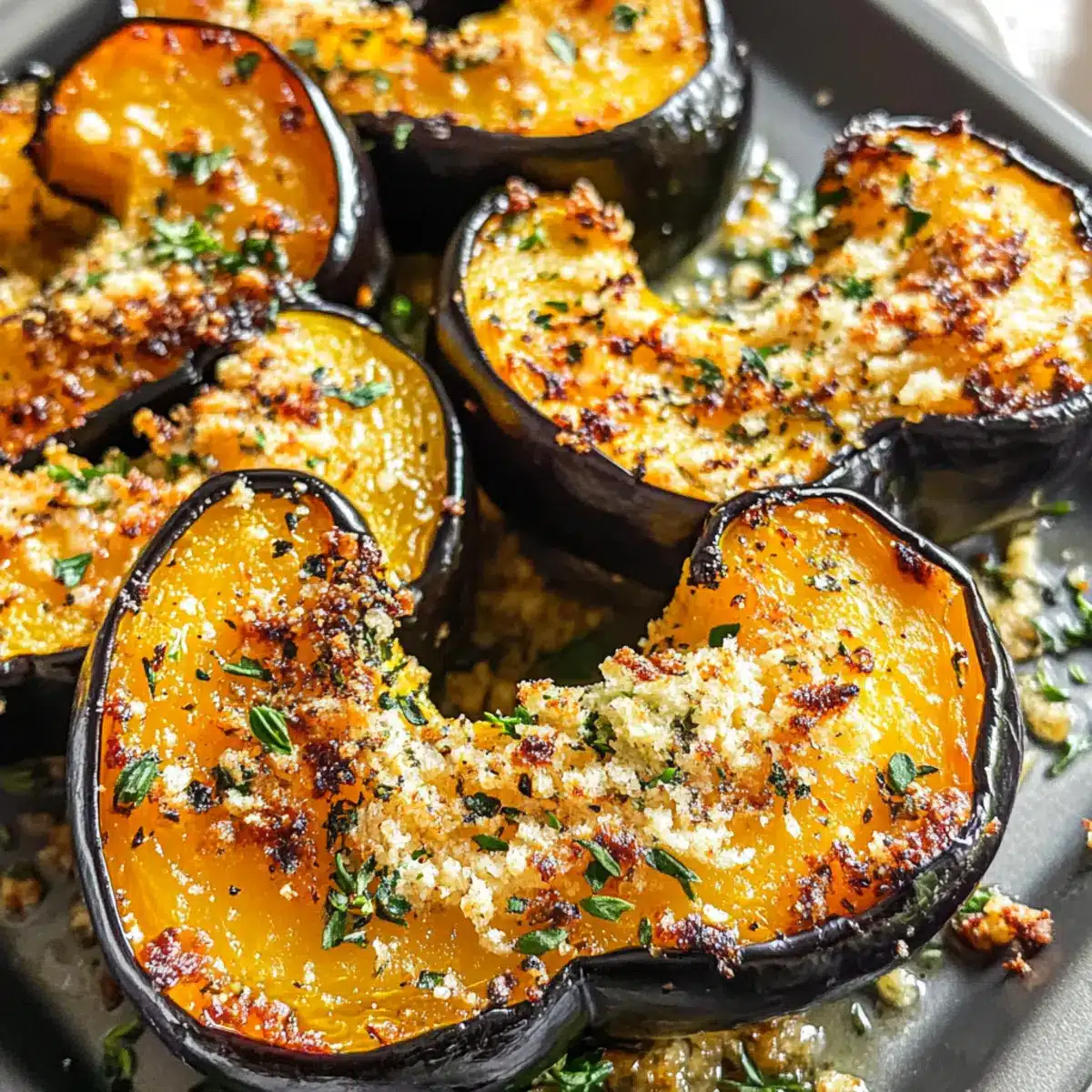 Herzhaftes Aroma: Frisch gerösteter Eichelkürbis mit einer Käsekruste aus Parmesan und aromatischen Kräutern sorgt für ein Geschmackserlebnis, das begeistert.