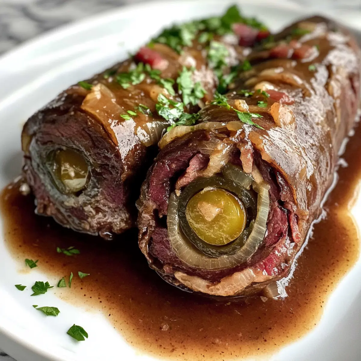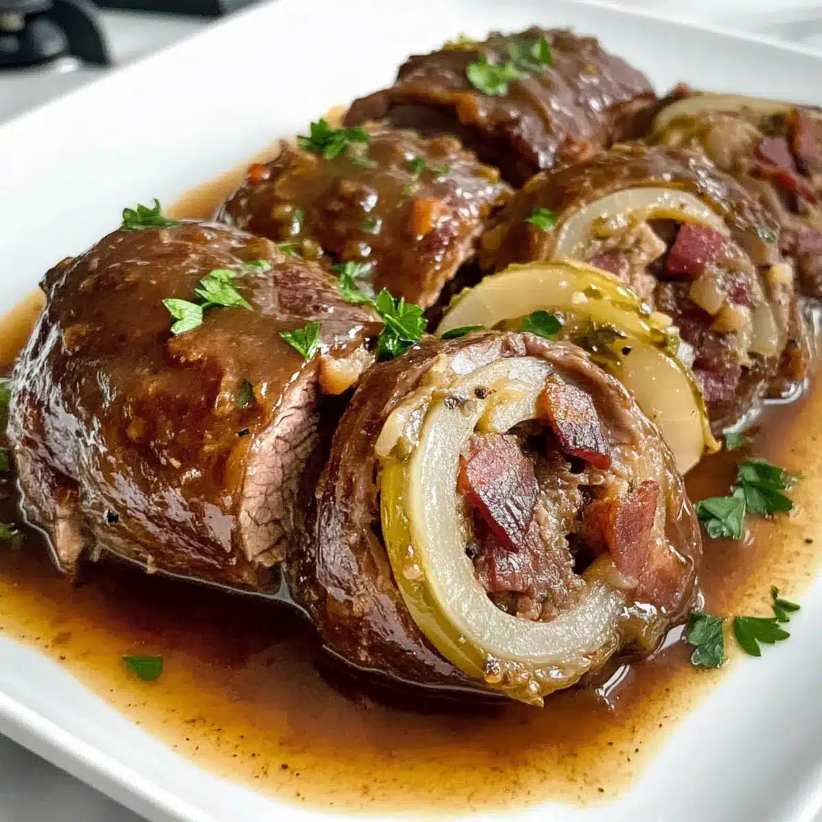 Einfachheit, die überzeugt: Dieses Rezept erfordert nur grundlegende Kochfähigkeiten und lässt sich mühelos umsetzen. Reiche Geschmäcker: Die Kombination aus Senf, Speck und Essiggurken sorgt für ein unvergleichliches Geschmackserlebnis, das alle begeistert. Zeitersparnis: Bereiten Sie die Rindfleischrouladen im Voraus vor und genießen Sie ein schnelles, köstliches Abendessen. Vielseitigkeit: Ob an Feiertagen oder beim gemütlichen Dinner – Rindfleischrouladen passen immer! Teilen Sie diese herzliche Speise mit Ihren Liebsten und erleben Sie, wie sie die Tafel erhellt. Hier sind auch einige Tipps für perfekt zubereitete Rindfleischrouladen, die Ihre Kochkünste unter Beweis stellen!
