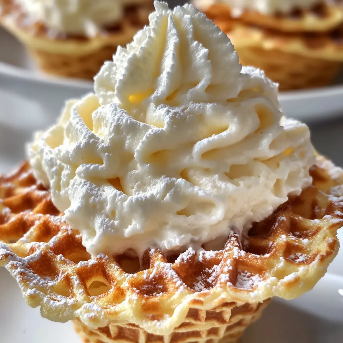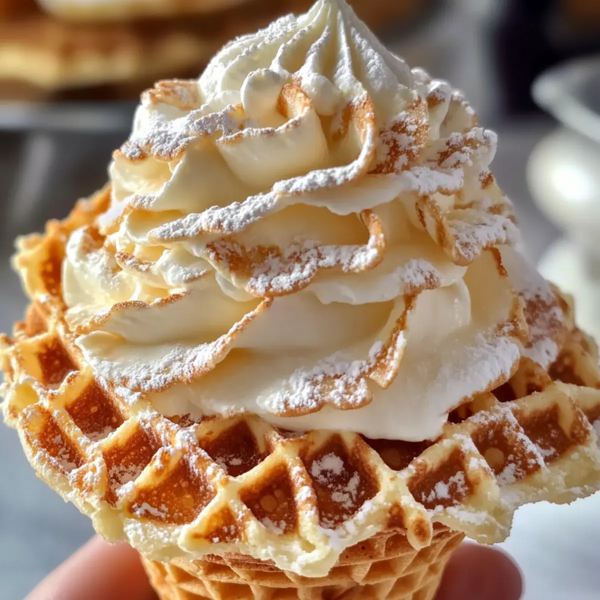 - Abgekühlte Pizzelle-Kegel mit Füllung füllen und dekorativ mit Puderzucker bestäuben.