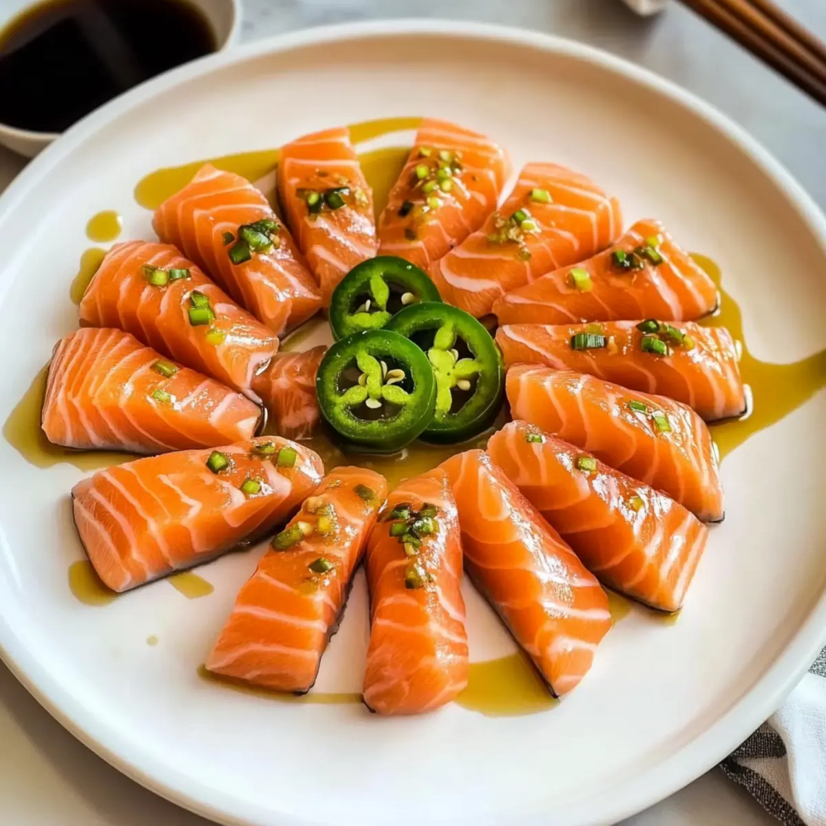 Die frische Brise des Meeres wehte über das Fischerdorf, als ich das erste Mal in die Welt des Sashimi eintauchte. Vor allem, als ich das Scharfe Lachs Sashimi mit Ponzusauce entdeckte, fühlte ich mich sofort in die kulinarischen Straßen Tokios versetzt. In weniger als 10 Minuten zauberst du mit diesem Rezept eine verführerische Vorspeise, die nicht nur schnell zubereitet ist, sondern auch eine perfekte Gesellschaft für gesellige Abende bietet. Der zarte, sushi-qualitäts Lachs vereint sich mit der spritzigen Ponzusauce und optionalen jalapeños für ein aufregendes Geschmackserlebnis. Bereit, deine Geschmacksnerven auf eine kleine Reise zu schicken?