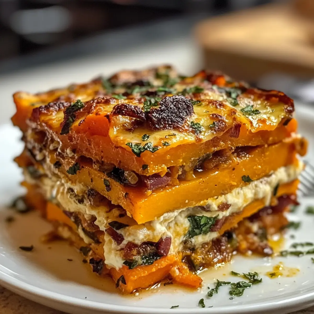 Einzigartige Geschmackskombination: Diese schichtige Süßkartoffel-Banane-Karotten-Lasagne vereint die süßen Aromen von Wurzelgemüse, die perfekt mit der cremigen Béchamelsauce harmonieren.