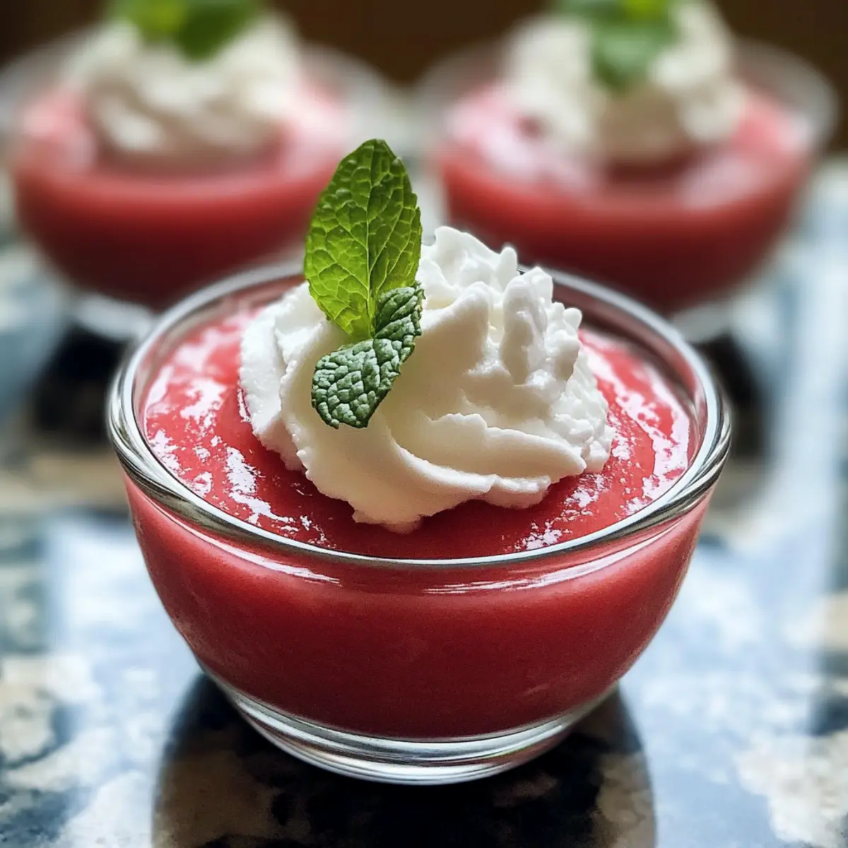 Vor dem Servieren kannst du den Pudding nach Belieben mit aufgeschlagener Kokoscreme und frischen Minzblättern garnieren. Diese zusätzlichen Toppings verleihen dem sizilianischen Wassermelonenpudding eine schöne Optik und zusätzlichen Geschmack, der perfekt zu diesem erfrischenden Dessert passt.