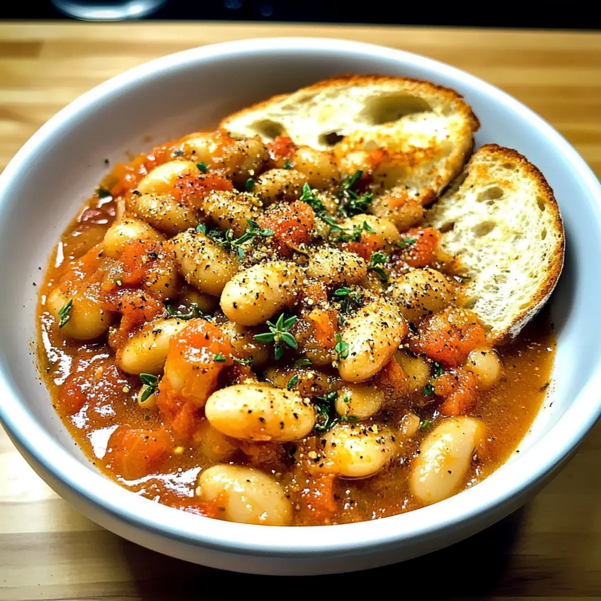 Wenn die Kochzeit beendet ist und die Bohnen die gewünschte Konsistenz erreicht haben, nimm den Deckel ab und rühre die Bohnen sanft um. Entferne das Lorbeerblatt und bereite das Servieren vor, indem du die Bohnen über geröstetes Brot löffelst. Optional kannst du die Mischung mit gehobeltem Parmesan und frisch gemahlenem Pfeffer garnieren.