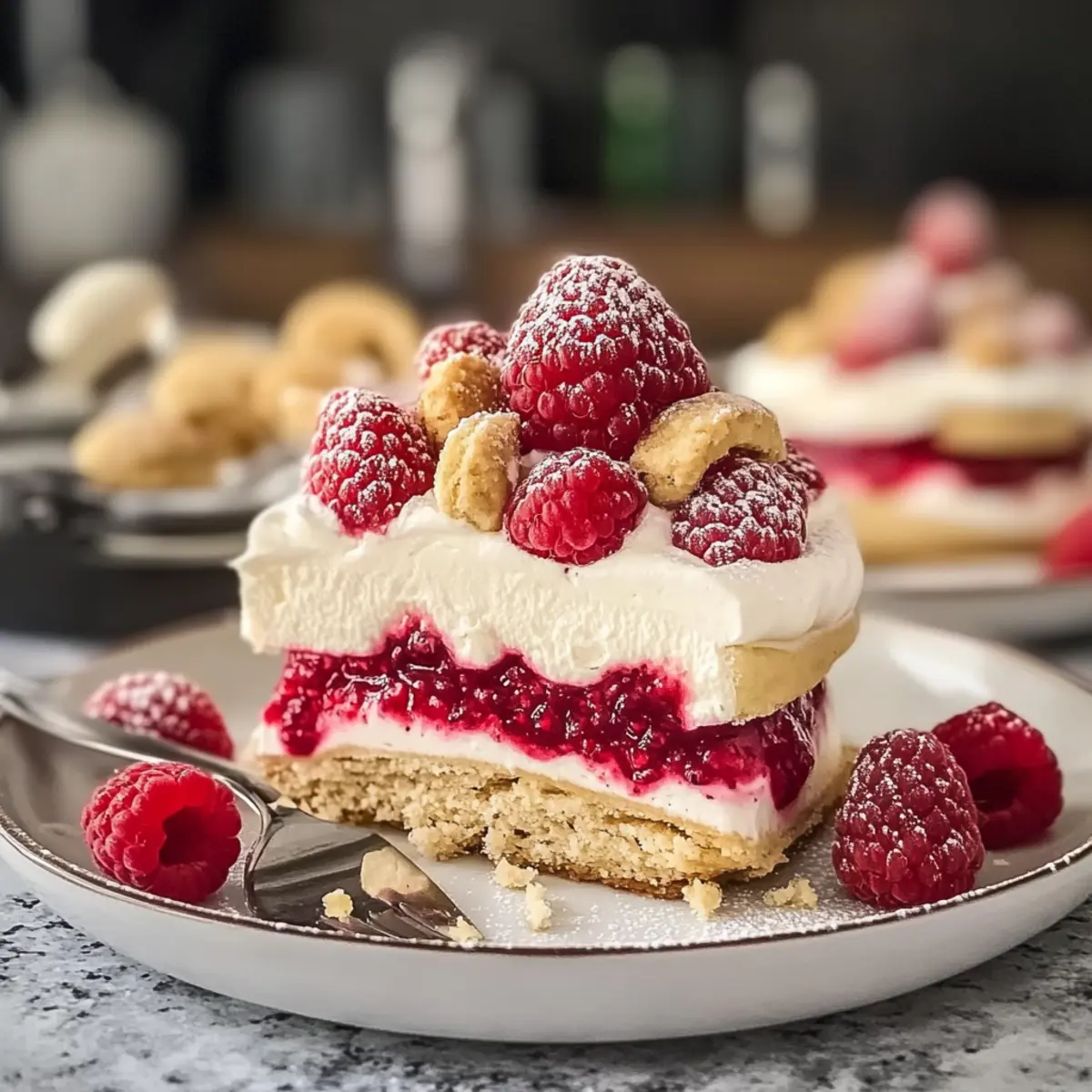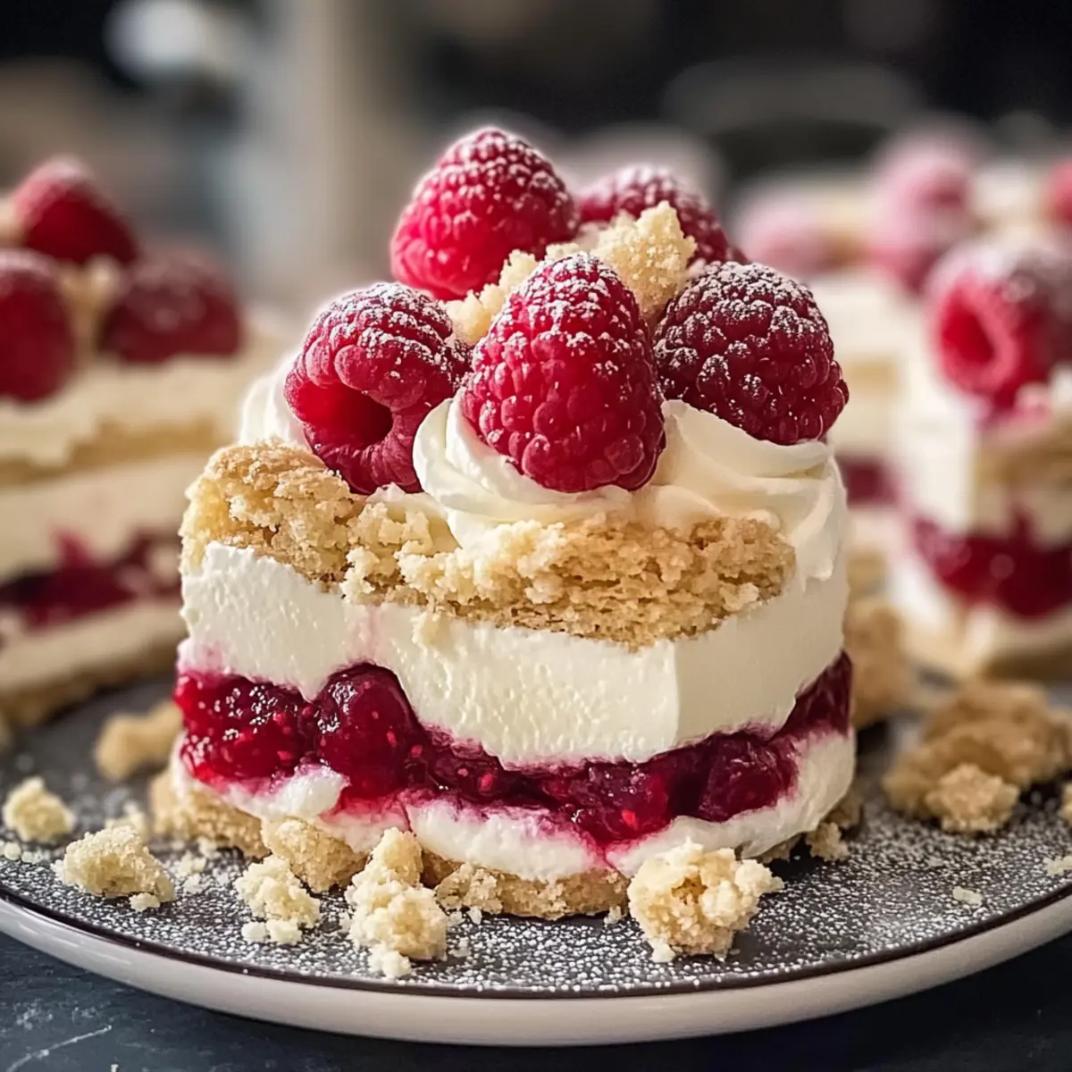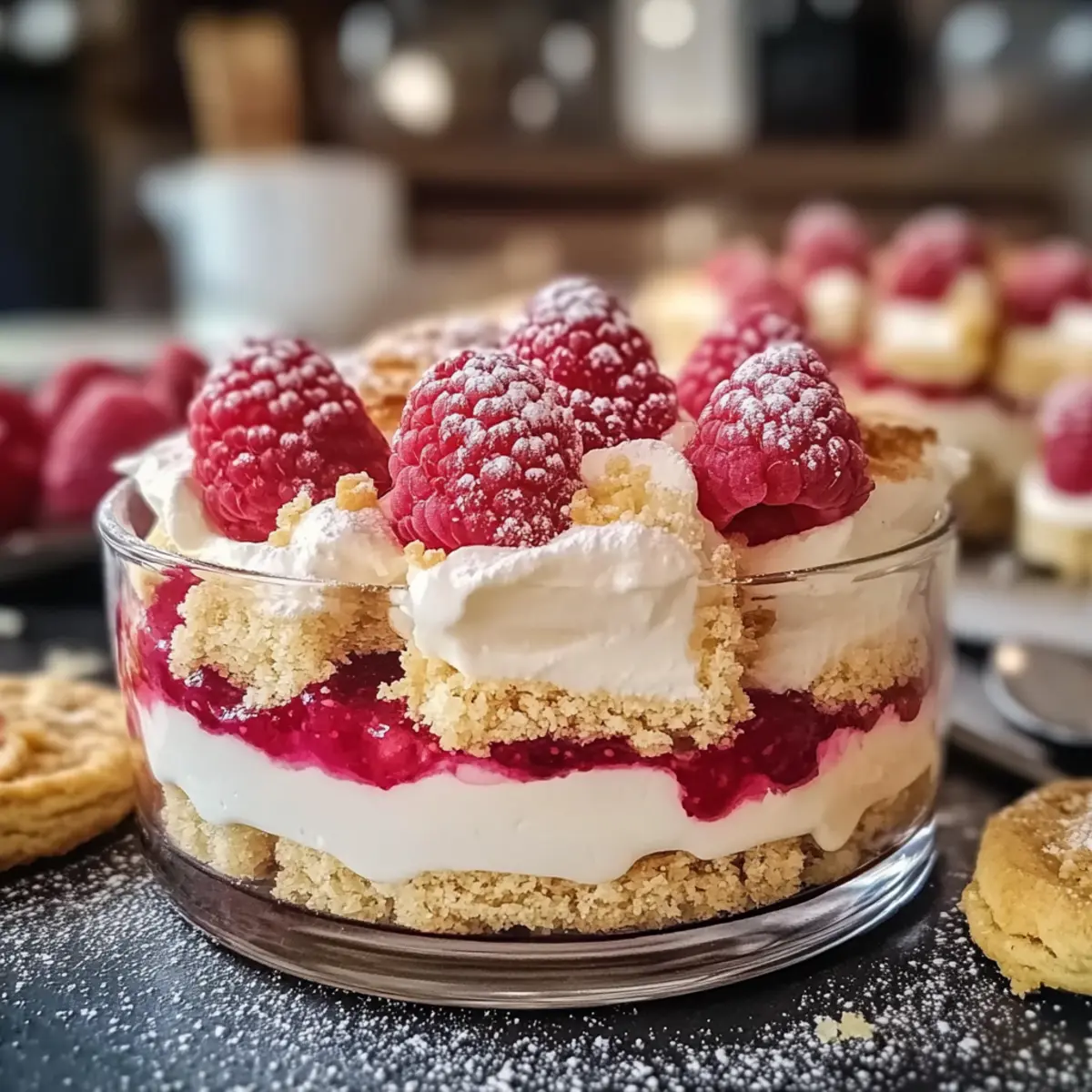 • Anrichten: Für eine ansprechende Präsentation, pipetiere die Sahne auf die Creme und dekoriere mit ganzen Himbeeren und Vanillekipferl-Keksen.