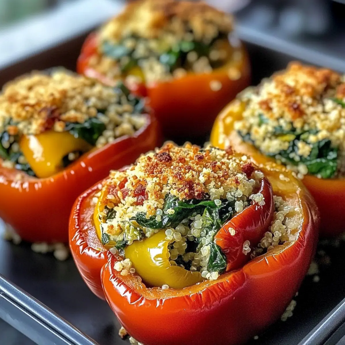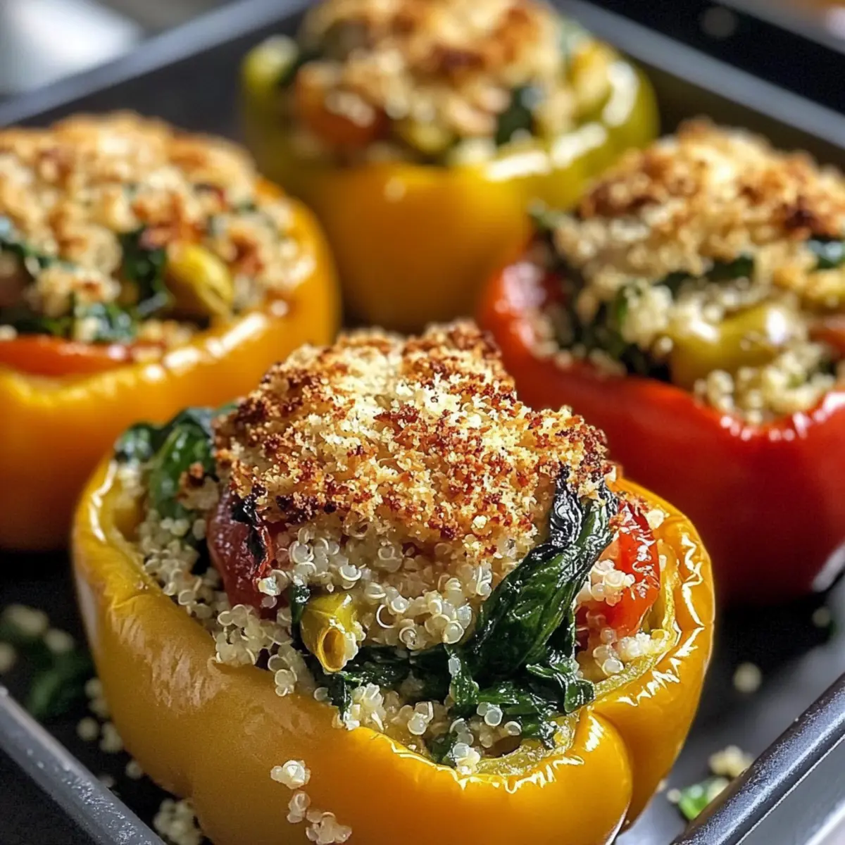 - Mischen Sie Semmelbrösel mit Olivenöl und streuen Sie sie über die gefüllten Paprika.