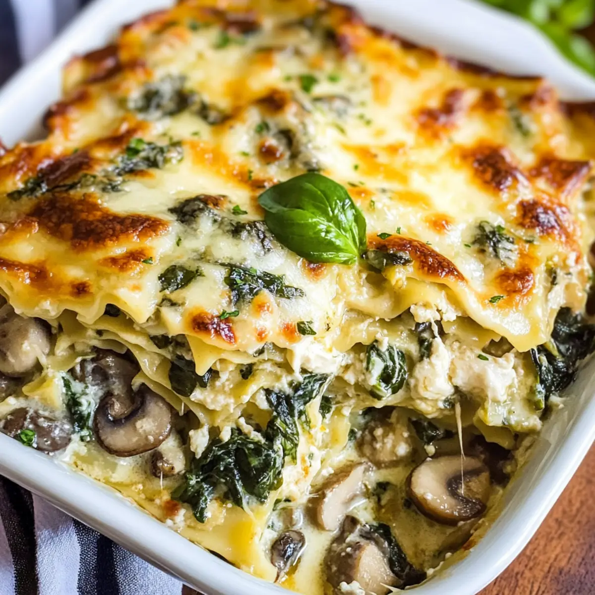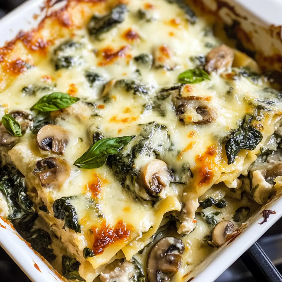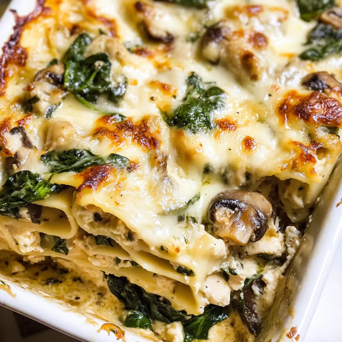 Weiße Hühnerlasagne mit Spinat und Pilzen