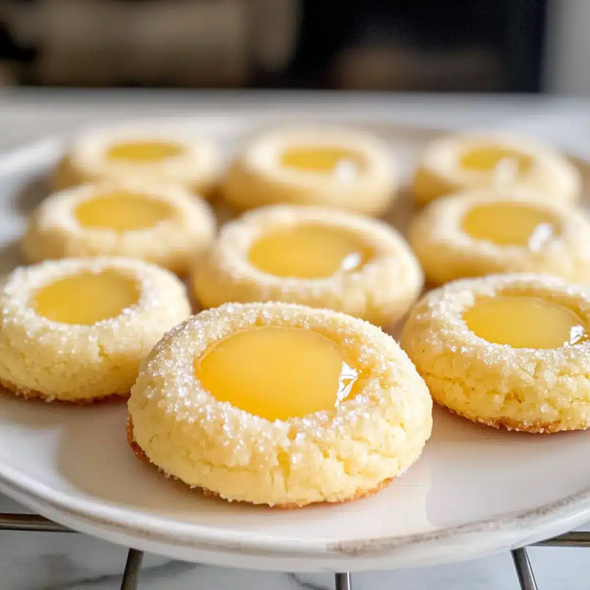 Nachdem die Kekse vollständig abgekühlt sind, fülle die Vertiefungen großzügig mit der frisch zubereiteten Zitronencreme. Stelle sicher, dass die Creme gleichmäßig verteilt ist. Lasse die gefüllten Kekse 30 Minuten im Kühlschrank, damit sich die Aromen verstärken und die Textur ideal ist.